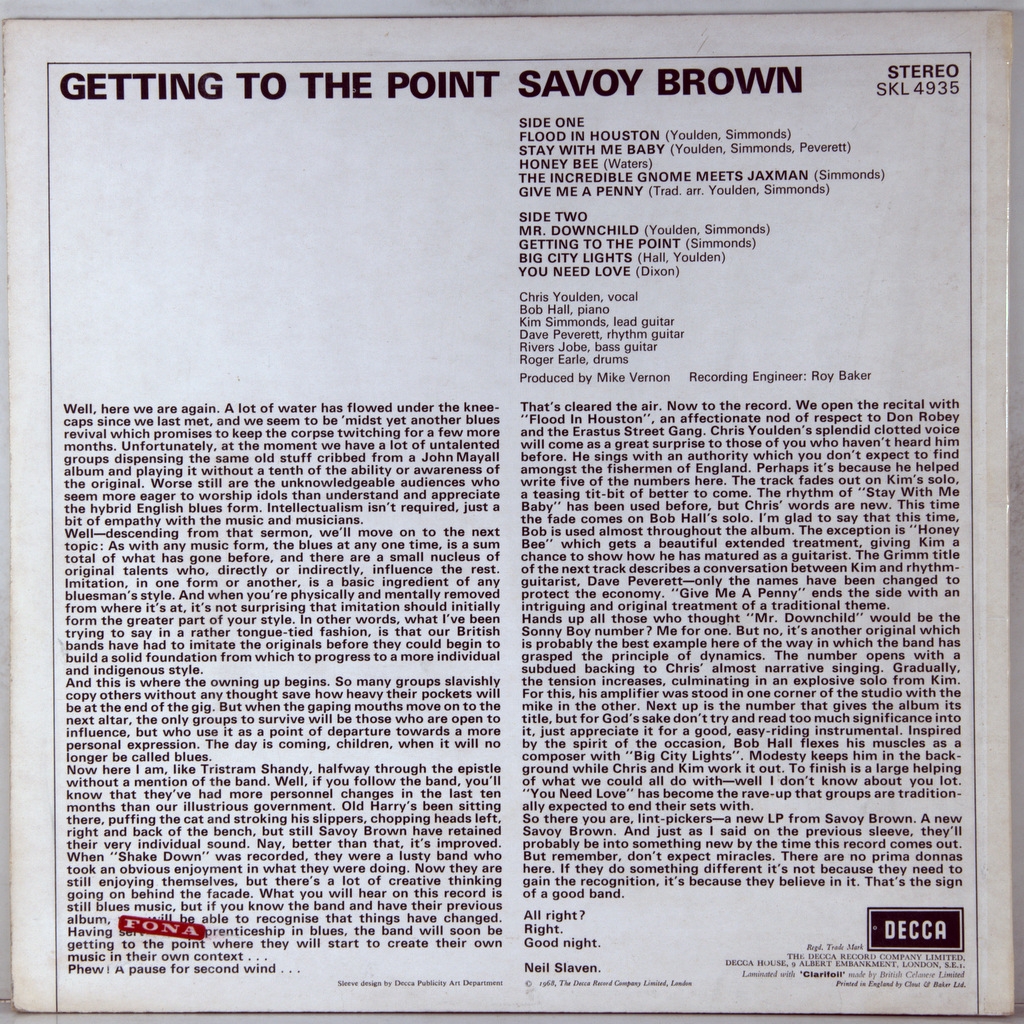 SAVOY BROWN-GETTING TO THE POINT -1968-ПЕРВЫЙ ПРЕСС (STEREO) UK-DECCA-SKL4935 Матрицы A-1W/B-1W. Редкий британский оригинал культовой блюз-роковой группы. Getting to the Point — второй студийный альбом английской блюз-рок-группы Savoy Brown. Он знаменует собой дебют совершенно нового состава, который по-прежнему возглавляет Ким Симмондс, но фронтменом стал новый вокалист Крис Юлден. Он был выпущен лейблом Decca в 1968 году под каталожным номером SKL 4935. В отличие от своего дебютного альбома, состоявшего в основном из каверов, на этом альбоме группа взяла на себя больше обязанностей по написанию песен.