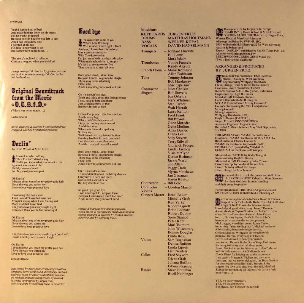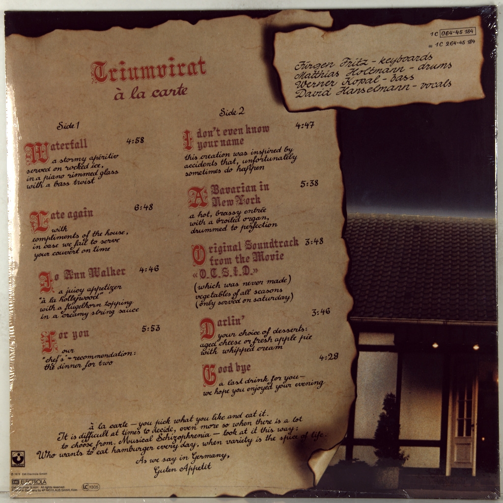 TRIUMVIRAT-A LA CARTE-1978-ПЕРВЫЙ ПРЕСС GERMANY-HARVEST-1C064-45184. Редкий германский оригинал культовой прог группы. A la Carte - 6-й студийный и предпоследний альбом группы . "A La Carte" состоит из девяти треков и полностью отличается от их предыдущих пяти студийных альбомов, это даже больше похоже на совершенно другую группу. Устоявшийся стиль симфо-прогрессивного рока The Nice и Emerson, Lake and Palmer внезапно отброшен на этом альбоме, равно как и виртуозные клавишные игры лидера группы Юргена Фрица. Вместо них у нас есть коллекция мелодий в стиле поп-рок, которые заменили напыщенность и богатство прежних аранжировок, на музыкальные произведения в духе Supertramp. Несомненно, альбом отражает наиболее коммерческое значение группы в те дни и превращает альбом в настоящий праздник поп-рока. Хотя создание поп-альбома не является грехом. Великие музыканты, такие как Ханс-Юрген Фриц, исполняют поп-песни так, как другие поп-исполнители могут только мечтать. Кто выигрывает от этого, так это поп-музыка. Хороший альбом, который просто не стоит сравнивать с первыми альбомами группы.