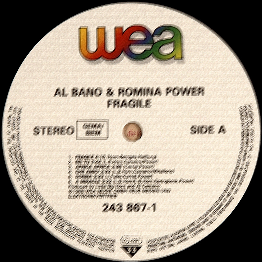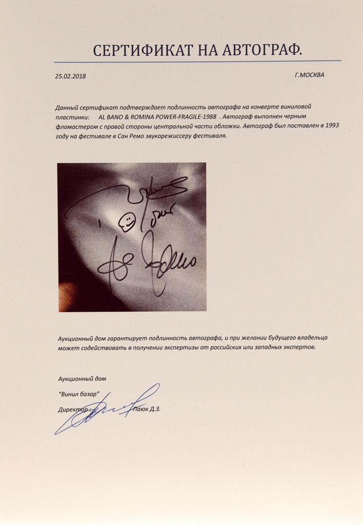 *****АВТОГРАФ****-BANO, AL & ROMINA POWER-FRAGILE-1988-ПЕРВЫЙ ПРЕСС GERMANY-WEA номер 243867-1 Автограф был сделан звукорежиссеру фестиваля САН РЕМО в 1993 году. Сопровождается с сертификатом от АД"Винил базар"