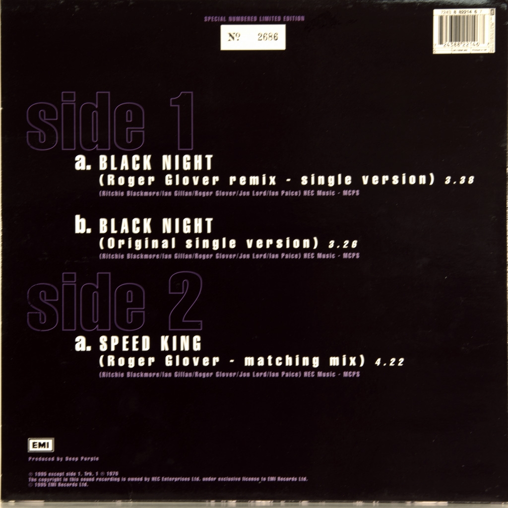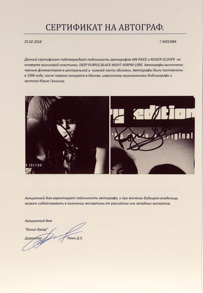 ***АВТОГРАФЫ***ROGER GLOVER , IAN PAICE*** DEEP PURPLE,BLACK NIGHT-45RPM LIMITED EDITION -N 2686 , MAXI-SINGLE UK 1995 EMI номер 12EM382/724388221467. Редкие автографы ROGER GLOVER , IAN PAICE на обложке . Автографы были поставлены после первого концерта в Москве в 1996 году известному музыкальному библиографу и критику Юрию Гришину. Аукционный дом прилагает свой сертификат.