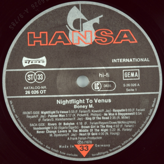 BONEY M-NIGHTFLIGHT TO VENUS-1978-Первый пресс-GERMANY-HANSA-26026 OT. Редкий оригинал культового альбома. Nightflight to Venus-третий студийный альбом евро-карибской группы Boney M., выпущенный в июле 1978 года. Альбом стал крупным успехом в континентальной Европе, Скандинавии и Канаде, возглавив большинство чартов альбомов во второй половине 1978 года, а также стал их первым альбомом номер один в Великобритании. В Канаде альбом получил номинацию на премию Juno 1980 года в категории "Международный альбом года". Nightflight to Venus включает в себя мировые хиты "Реки Вавилона" и "Коричневая девушка на ринге", двусторонний сингл, который возглавил британский чарт синглов и разошелся тиражом более 2 миллионов копий.[4] Продолжением стала еще одна классика Бони М., "Распутин", в большинстве стран также исполнявшаяся на двойной стороне А в сочетании с "Painter Man", кавер-версией хита 1966 года группы The Creation. В Великобритании "Rasputin" и "Painter Man" были выпущены отдельно как A-стороны лейблом Atlantic Records, оба вошли в Топ-10. "Реки Вавилона", достигшая 30-го места в чарте Billboard Hot 100, стала их самым большим хитом в США.