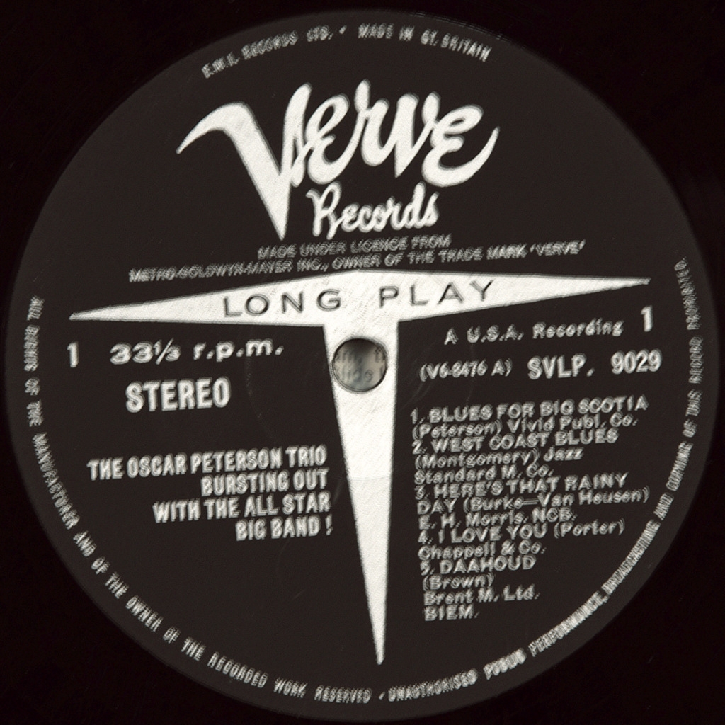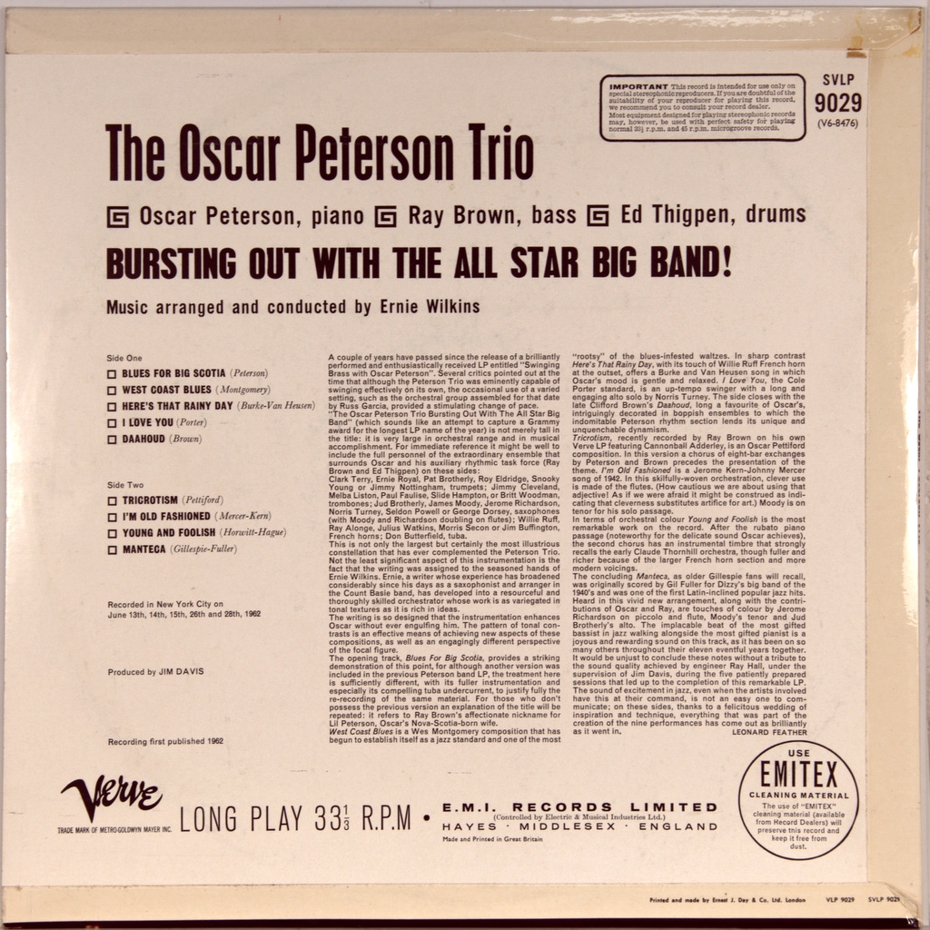 PETERSON, OSCAR TRIO-BURSTING OUT WITH THE ALL STAR BIG BAND (STEREO)-1962-ПЕРВЫЙ ПРЕСС UK-VERVE номер SVLP9029.Мега редкое STEREO оригинал!!!!