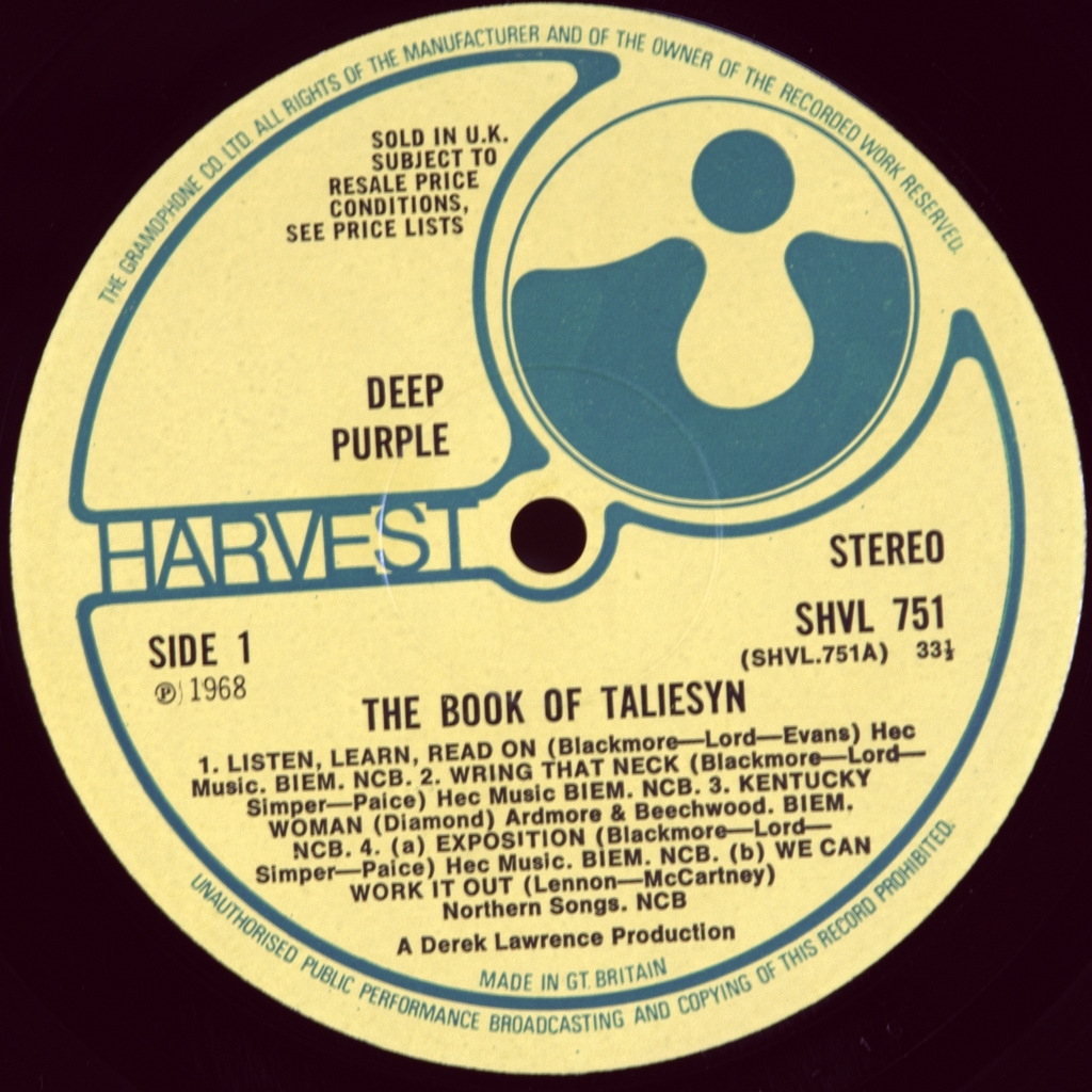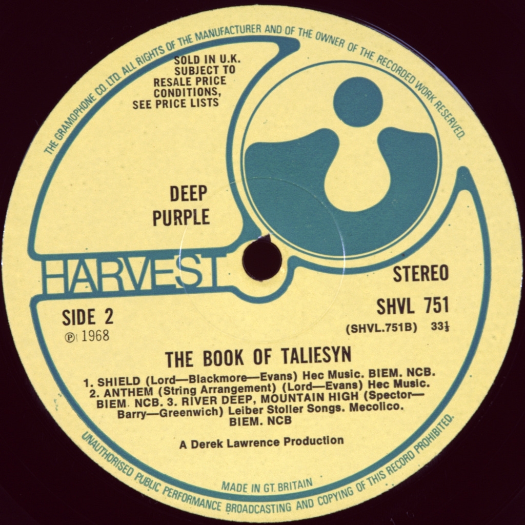 DEEP PURPLE-BOOK OF TALIESYN-1968-the SECOND UK PRESS-HARVEST number SHVL751 of the Matrix A-1G/B-1G Stamper 1L/1O (Dream!!!!) Mega rare second press (5 lines "sold in UK....."