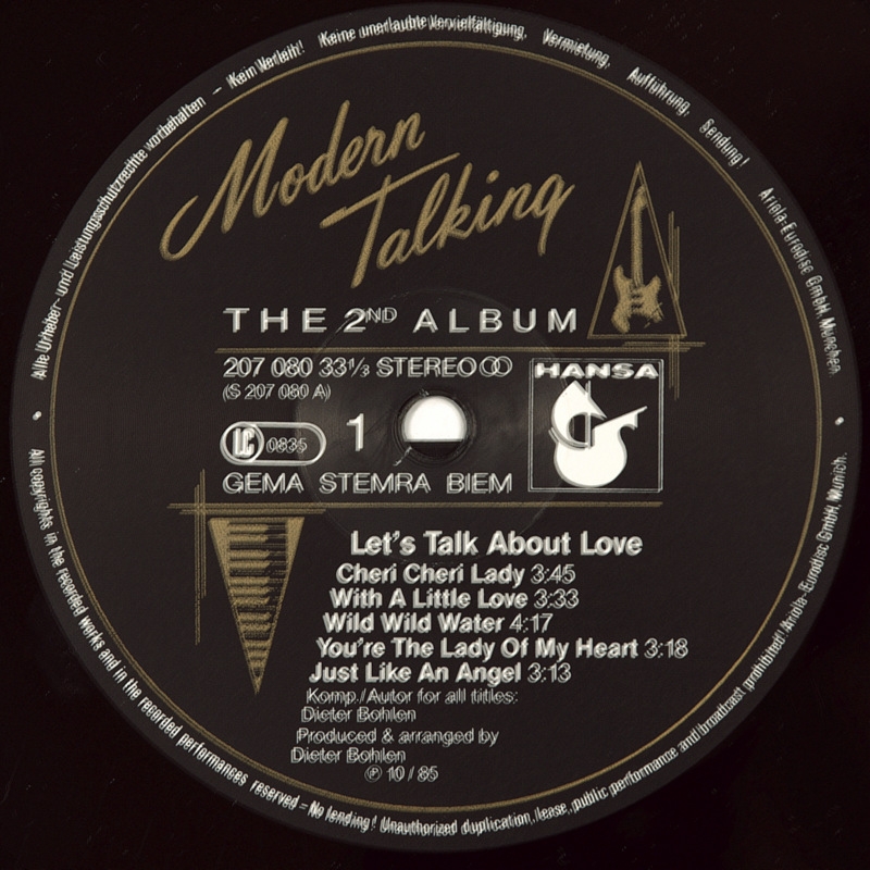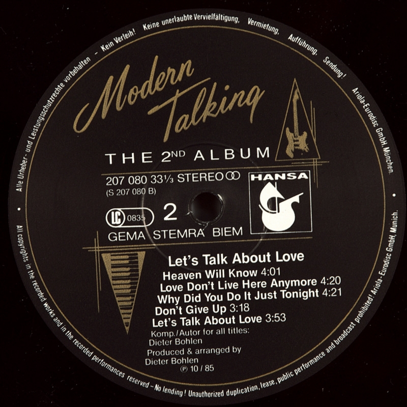The second album by German pop group MODERN TALKING-LET'S TALK ABOUT LOVE-1985 First GERMANY press-HANSA number- 207080