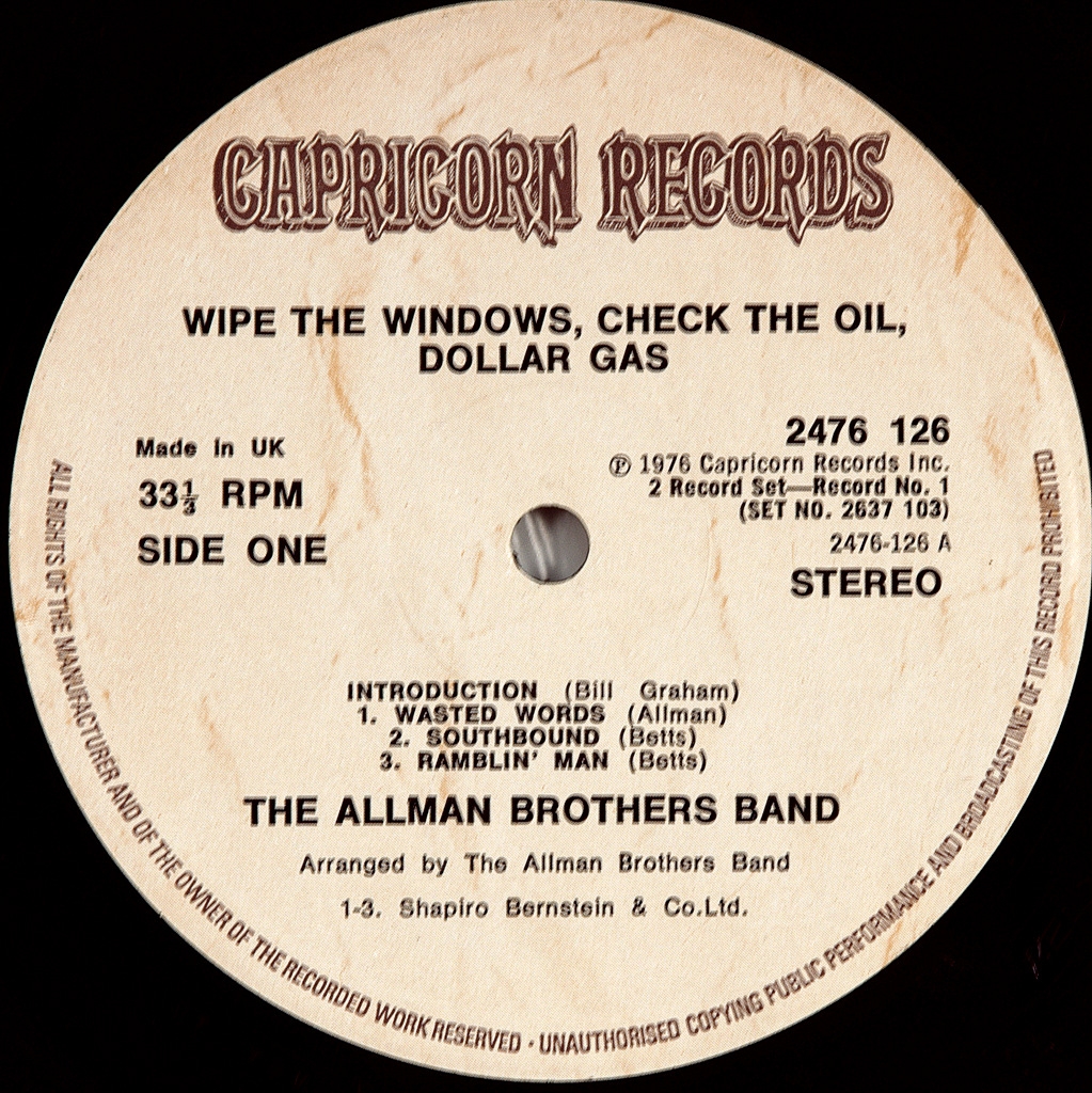 ALLMAN BROTHERS BAND-WIPE THE WINDOWS, CHECK THE OIL, DOLLAR GAS (2lp) -1976-FIRST UK PRESS-CAPRICORN 2637103 Rare British original Blues monsters of southern rock. A double live album. Built of many performances of the group since the beginning of 1970-ies. Released after the band had broken up.