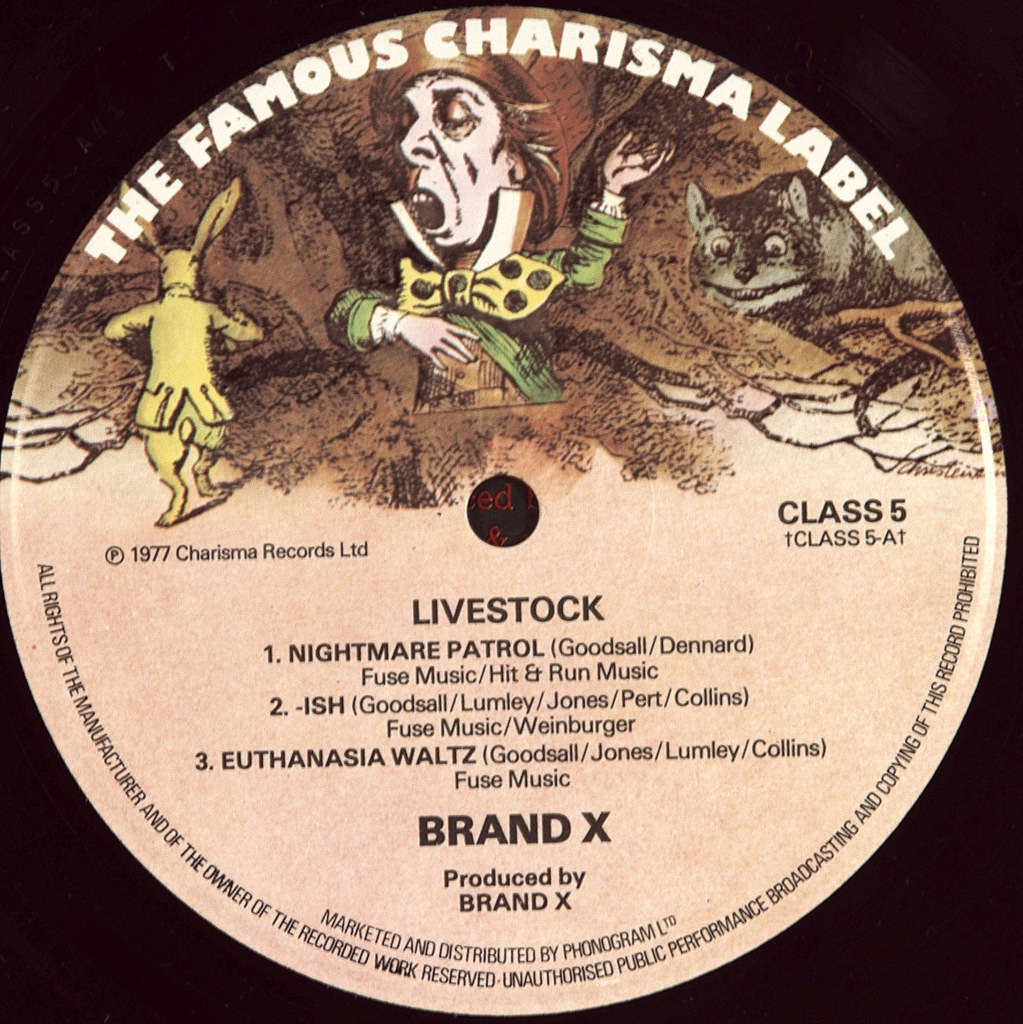BRAND X-LIVESTOCK-1977-FIRST UK PRESS-CHARISMA CLASS5 number of the Matrix A-1/B-1 . Rare British original. Brand X-a band consisting of ex-member of GENESIS performing in the style of jazz fusion.