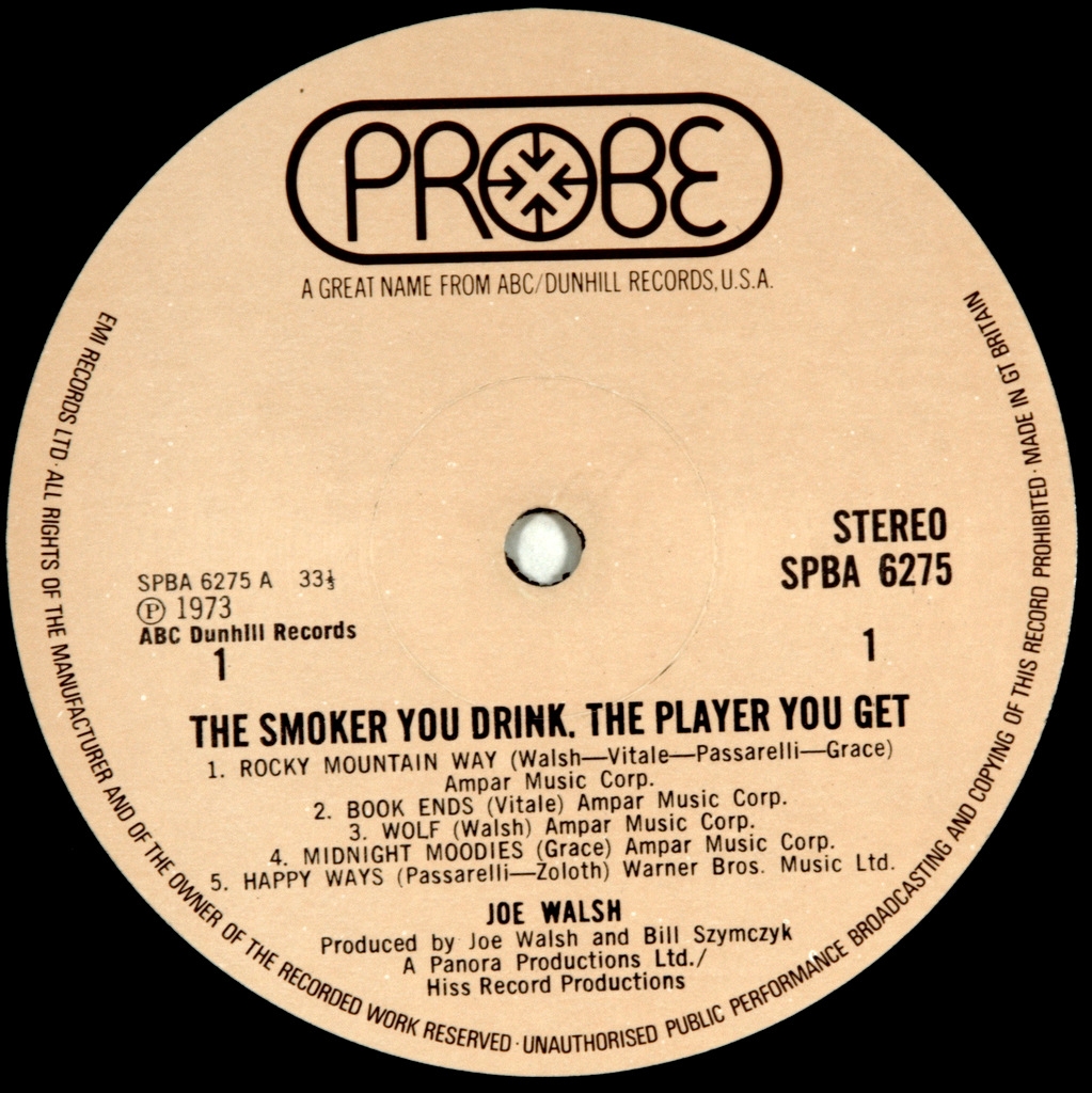 WALSH, JOE-SMOKER YOU DRINK, the PLATER YOU GET-1973-FIRST UK PRESS-PROBE SPBA6275 . Rare British original on the collector's label. The Smoker You Drink, Player You Get is the second Studio album by American singer-songwriter and multi-instrumentalist Joe Walsh.On this album, Walsh shares the vocals and songs with the other three members of Barnstorm, drummer / multi-instrumentalist Joe Vitale , bassist Kenny Passarelli and new member, keyboardist Rocke Grace. The result is isoproply album in several styles (Blues, rock, prog).