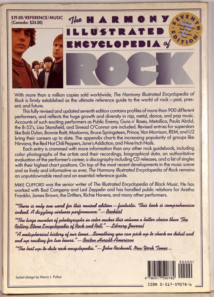 BOOK-ENCYCLOPEDIA-THE HARMONY ILLUSTRATED ENCYCLOPEDIA OF ROCK-1992-UK HARMONY BOOKS.Illustrated rock Handbook. 208 pages A4 format encyclopedic information about groups, including the genealogy of many compounds.