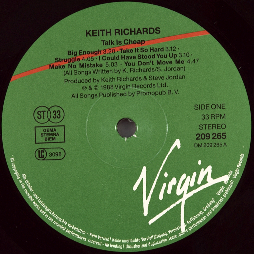 KEITH RICHARDS-TALK is CHEAP-1988-FIRST PRESS UK/EU-GERMANY-VIRGIN number 209265-630. The first solo work of the guitarist of the Rolling stones.