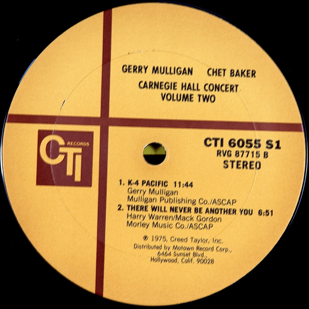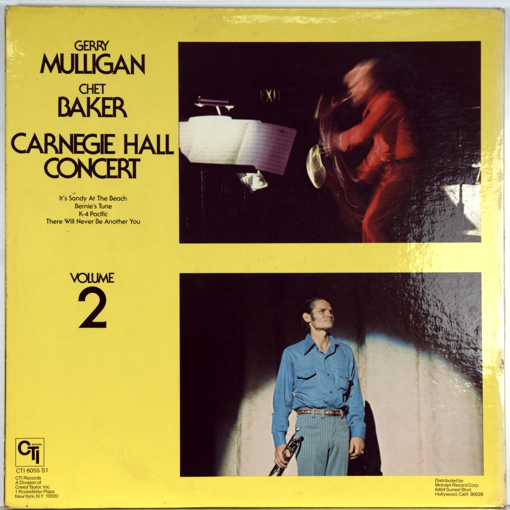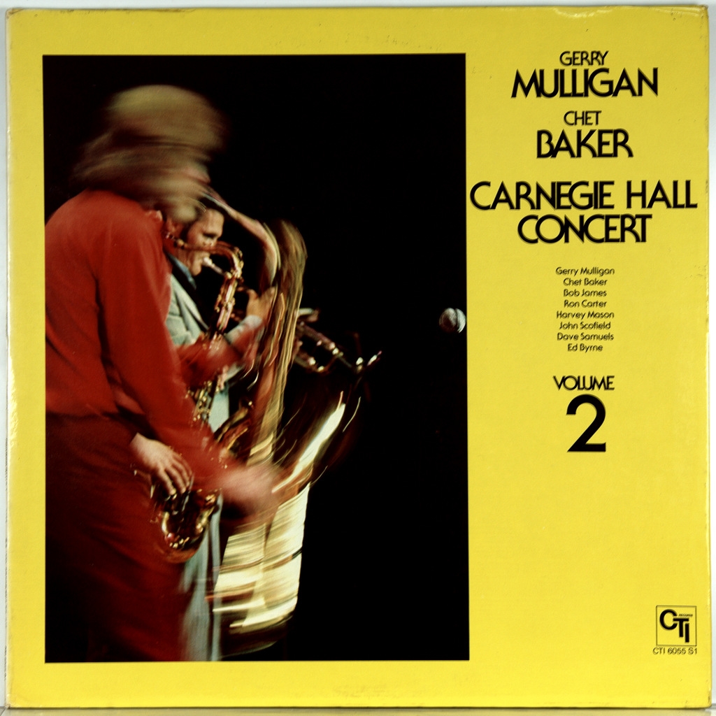 MULLIGAN, GERRY/CHET BAKER-CARNEGIE HALL CONCERT VOL.2-1975-FIRST PRESS USA-CTI -CTI6055S1. Rare original in archival condition. The concert in Carnegie Hall is a live album by saxophonist Gerry Mulligan and trumpeter Chet Baker. 1974 was one of the very rare reunions when they recorded together after Mulligan's original Quartet broke up in 1953.