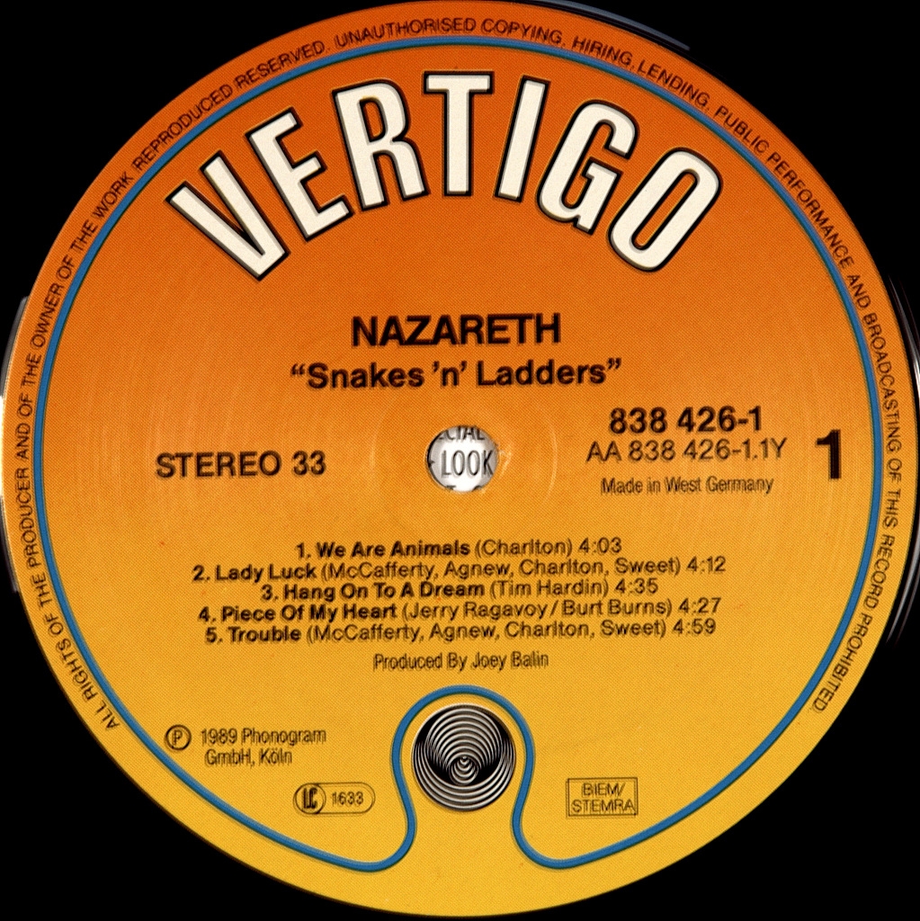 NAZARETH-SNAKES'N ' LADDERS-1989 - FIRST PRESS UK/EU-GERMANY-VERTIGO - 838426-1 Mega rare album is the only publication in Europe and the United States. The album is very hit and recognized as one of the best in the band's career.This was the last album recorded with the participation of Manny Charlton, who left the band in 1990.