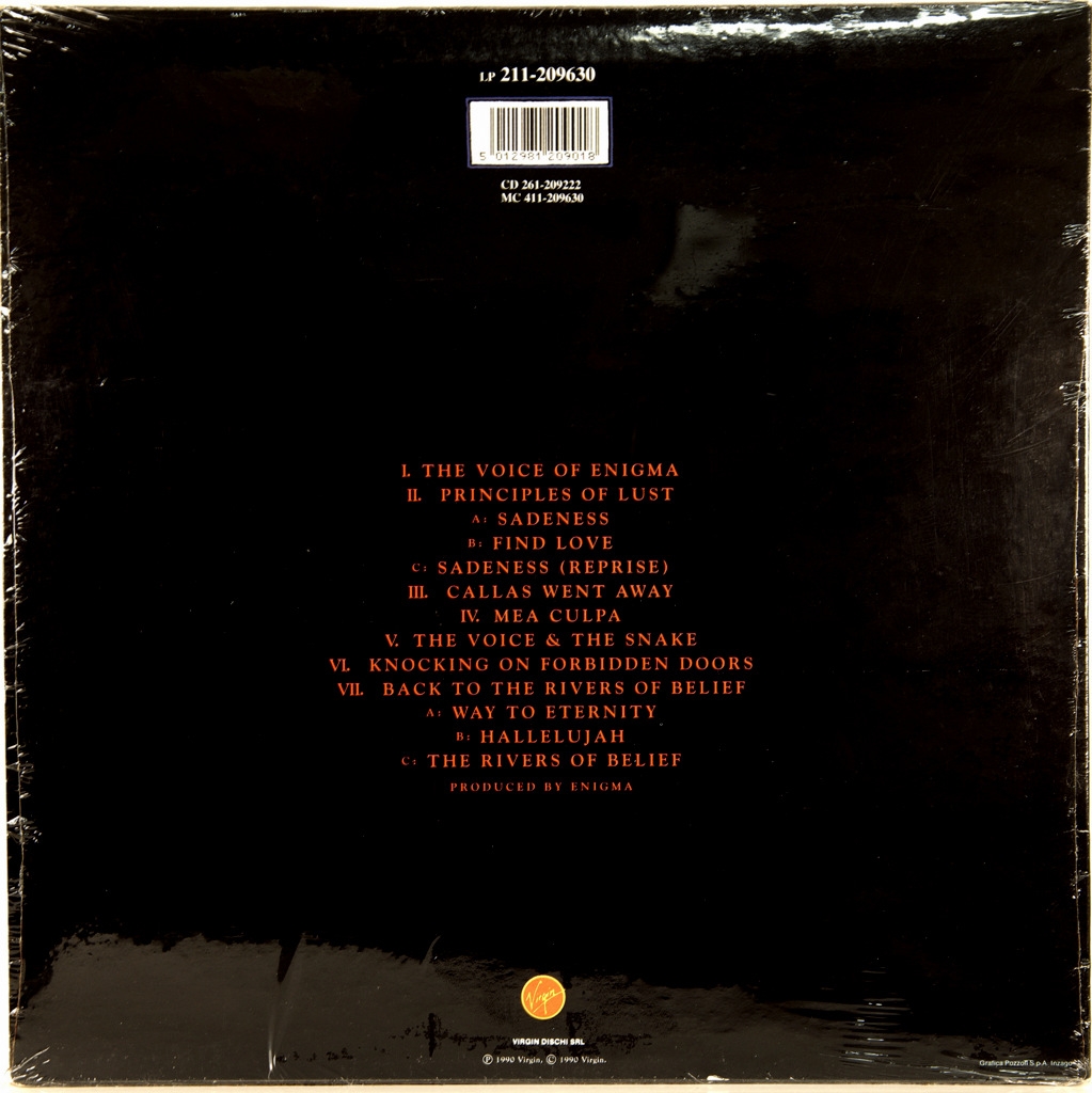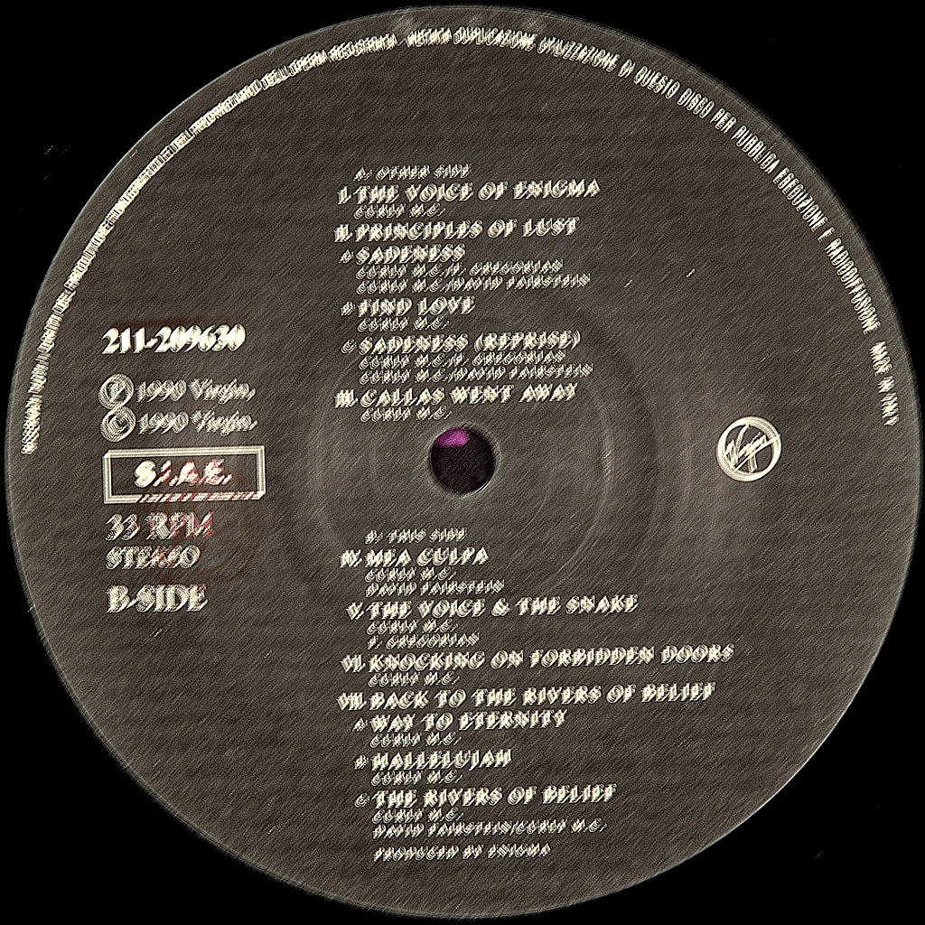 ENIGMA-MCMXC a.D.-1990-FIRST PRESS ITALY-VIRGIN - 211-209630. Mega rare original cult album. MCMXC a.D.- debut and most popular album of the project Enigma, released in 1990. Reaching the # 1 position in 41 countries, he collected 57 platinum awards-including triple platinum in the United States, where he remained the ranking of the albums on the Billboard 200 for five years.