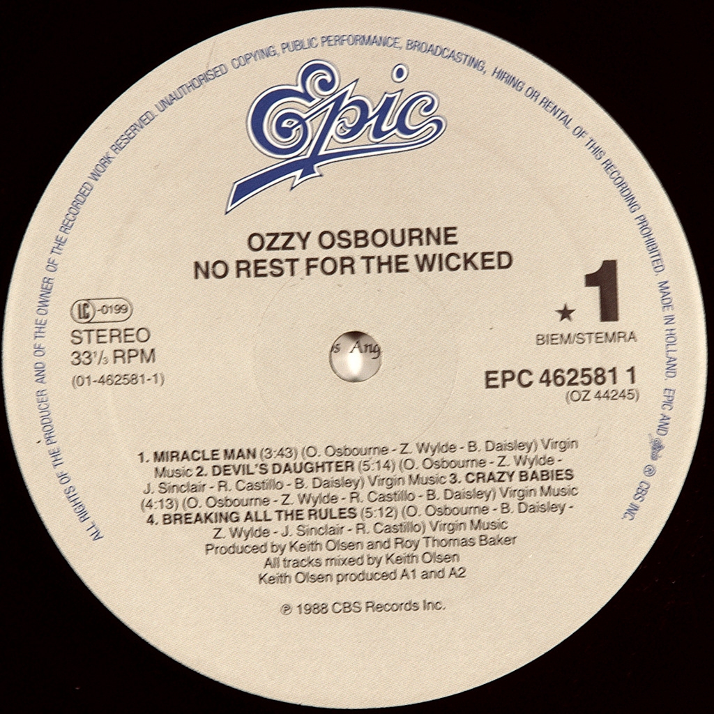OSBOURNE, OZZY-NO REST FOR THE WICKED-1988-FIRST HOLLAND PRESS-EPIC EPC4625811. Rare European original. No Rest for the Wicked is the fifth Studio album by British rock musician OZZY OSBOURN. This is the first album with guitarist Zakk Wylde. The album reached gold status in December 1989 and has since become double platinum. The album also reached position 13 in the Billboard 200.
