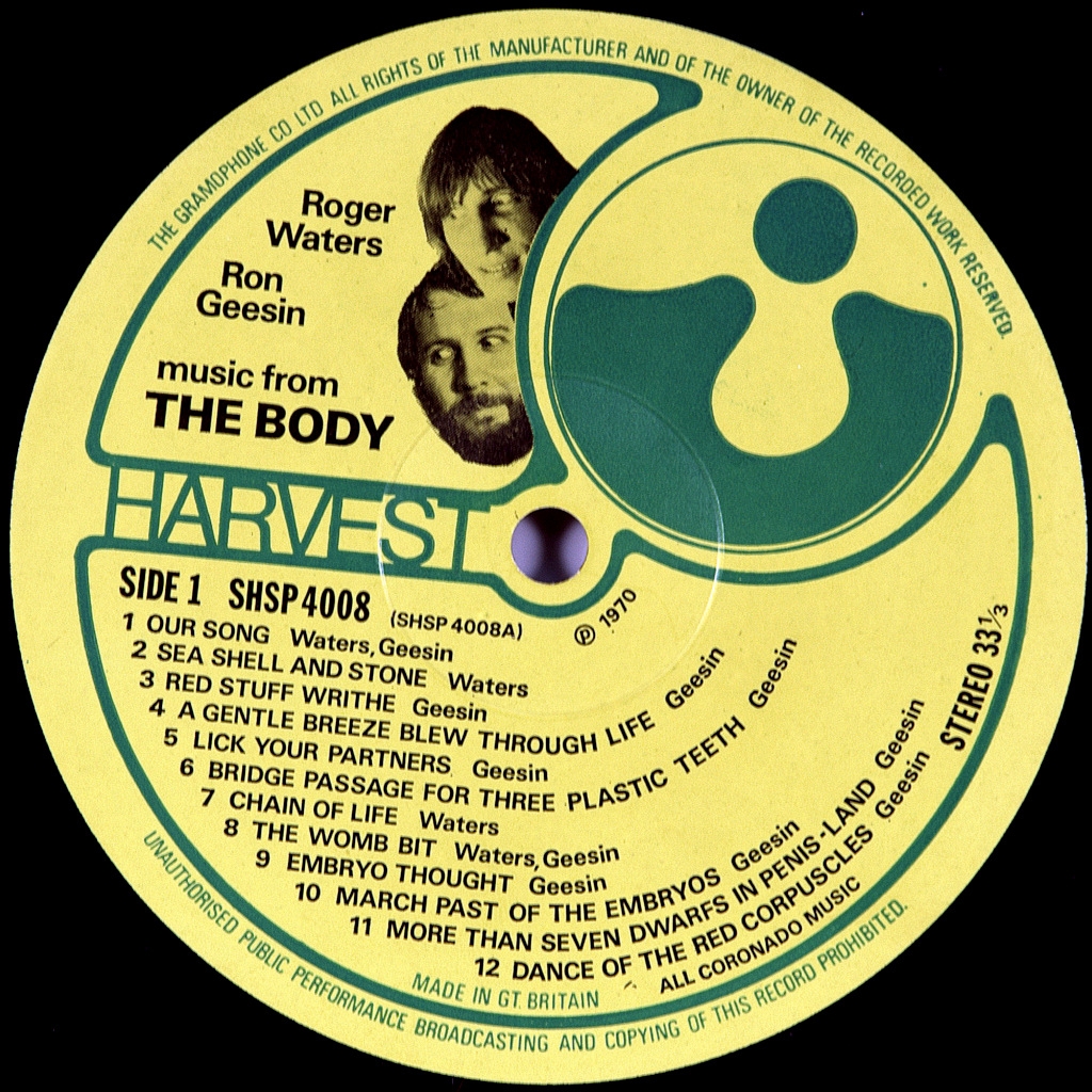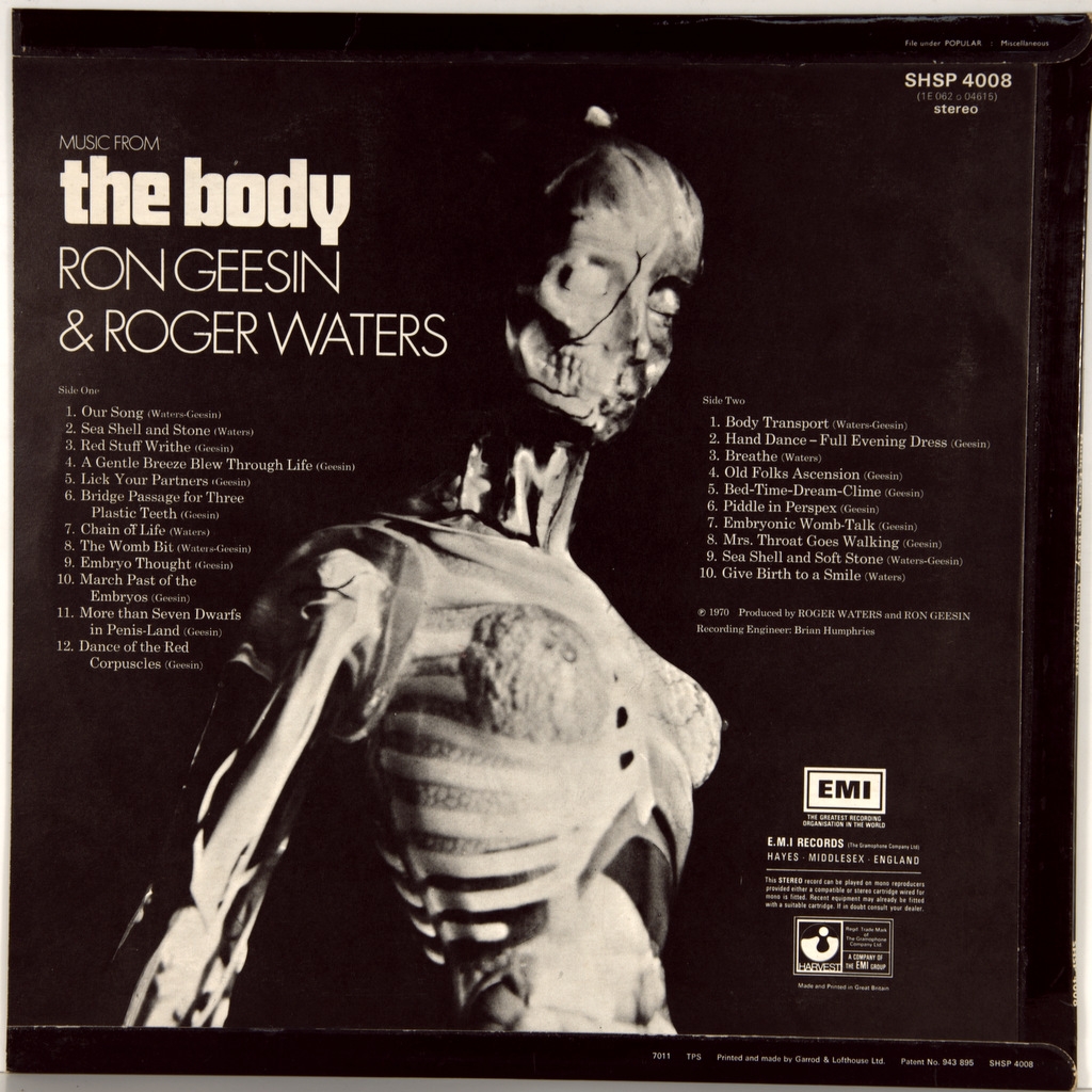 GEESIN, RON & WATERS, ROGER-MUSIC FROM THE BODY-1970-FIRST UK PRESS-HARVEST -SHSP4008. Of the matrix A-1/B-1 Stamper 1R/1G (Dream!) Very rare British original. Music from The Body — the experimental Studio альбомRon Geesin and Roger Waters, who represented the soundtrack to Roy Battersby's "The Body". The material for this album was written in collaboration between Ron Geesin and Pink Floyd member Roger Waters. In the last track of the album "Give Birth to a Smile" has all four members of Pink Floyd, and Geesin on piano, although David Gilmour, Nick Mason and Richard Wright were not marked on the envelope. On the cover of the album features a transparent anatomical mannequin.