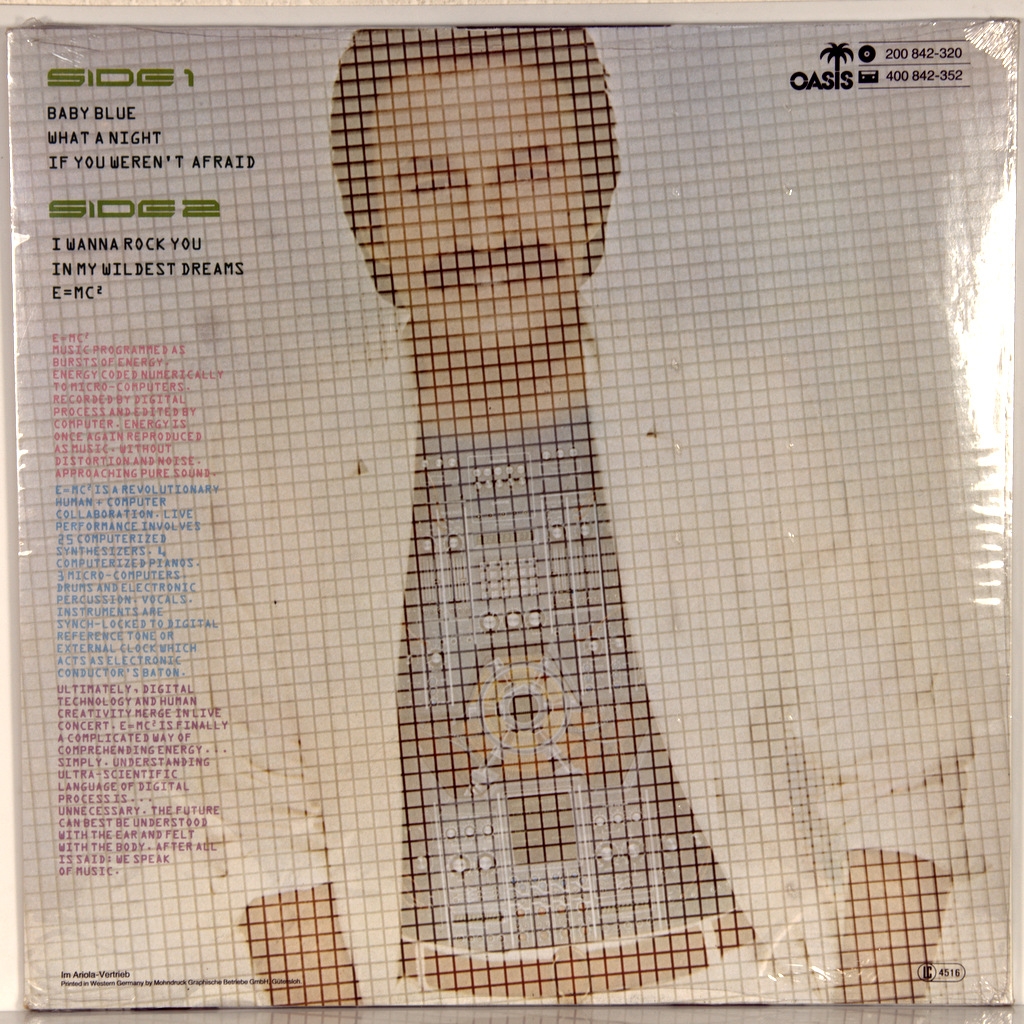 MORODER,GIORGIO-E=MC2-1979-FIRST PRESS GERMANY-OASIS -200842-320. Rare original cult album.E=MC2 album by Italian musician and producer GIORGIO MORODER. From the album were released as singles "Baby Blue", "If You weren't Afraid", "E=MC2" and "What a Night"; the Song "E=MC2" was ranked fourth in the chart Dance Music/Club Play Singles.