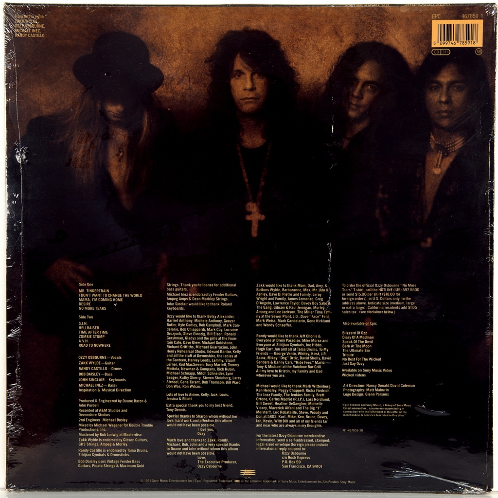 OSBOURNE, OZZY-NO MORE TEARS-1991-FIRST PRESS UK/EU-HOLLAND-EPIC 4678591.Mega rare original which was released only in the Netherlands. No More Tears is the sixth Studio album by British rock musician Ozzy Osbourne, was released on 17 September 1991. The album reached position # 17 on the UK Albums Chart (UK) and No. 6 in the Billboard 200. With the release of No More Tears was released five singles, four of which hit the top ten of the American Billboard Hot Mainstream Rock Tracks, including No. 2 — "Mama, I'm Coming Home". Also No More Tears is one of the two best-selling albums Osbourne in North America, it has certified four-times platinum status (RIAA) and twice platinum (CRIA); the second is considered to be the best-selling debut album called Blizzard of Ozz.