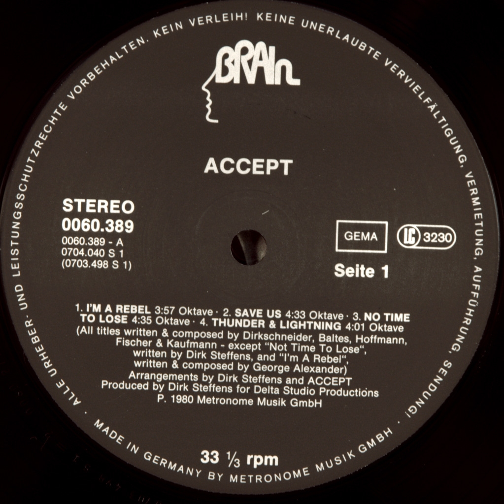 ACCEPT-I AM REBEL-1980-ORIGINAL PRESS 1982 GERMANY-BRAIN-0060.389. Rare early edition of the cult album from the German heavy metal. I'm a Rebel is the second album by the German heavy metal band Accept, released in 1980.