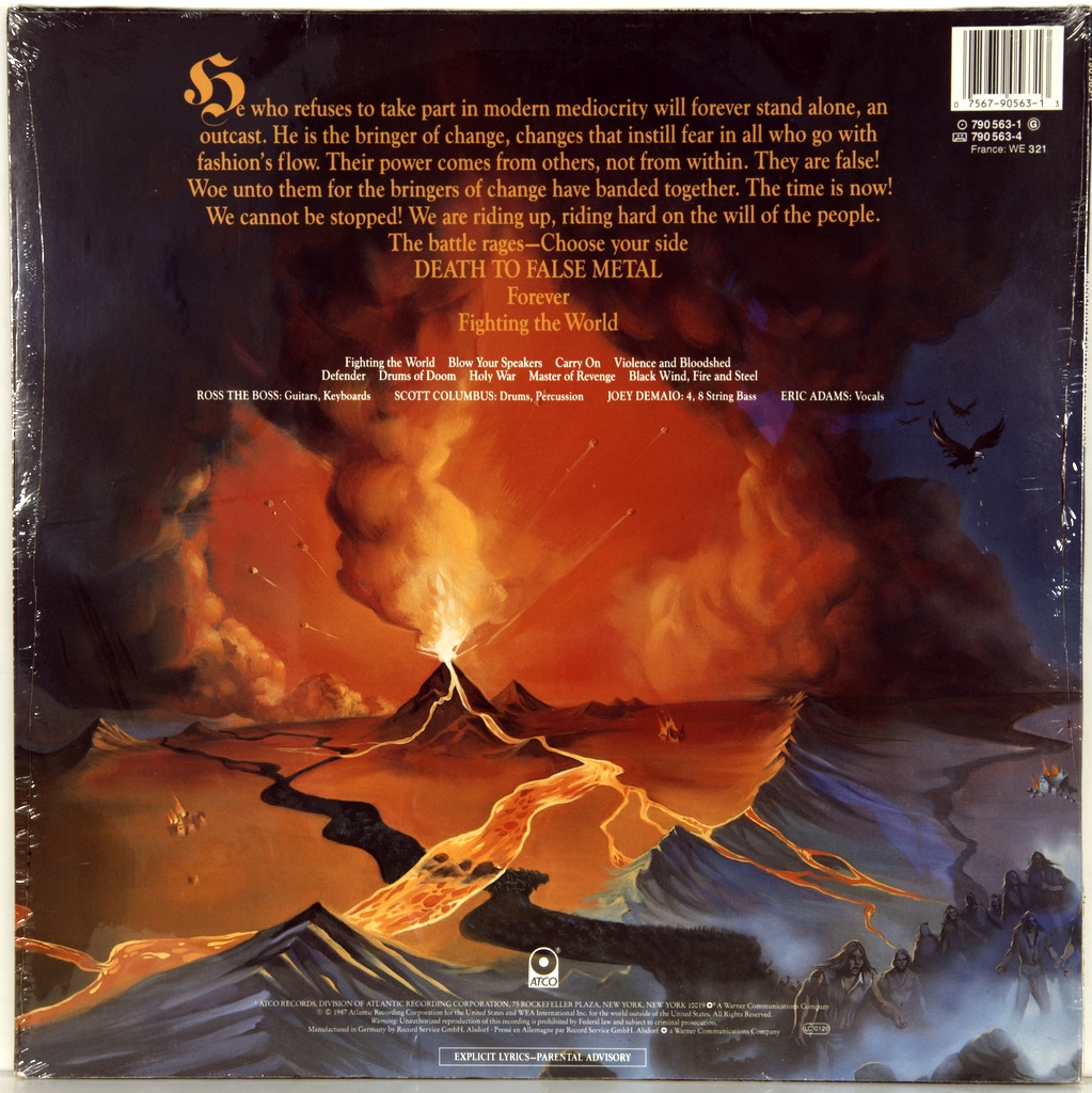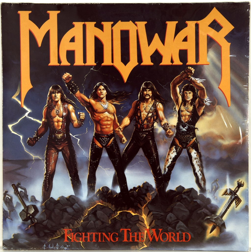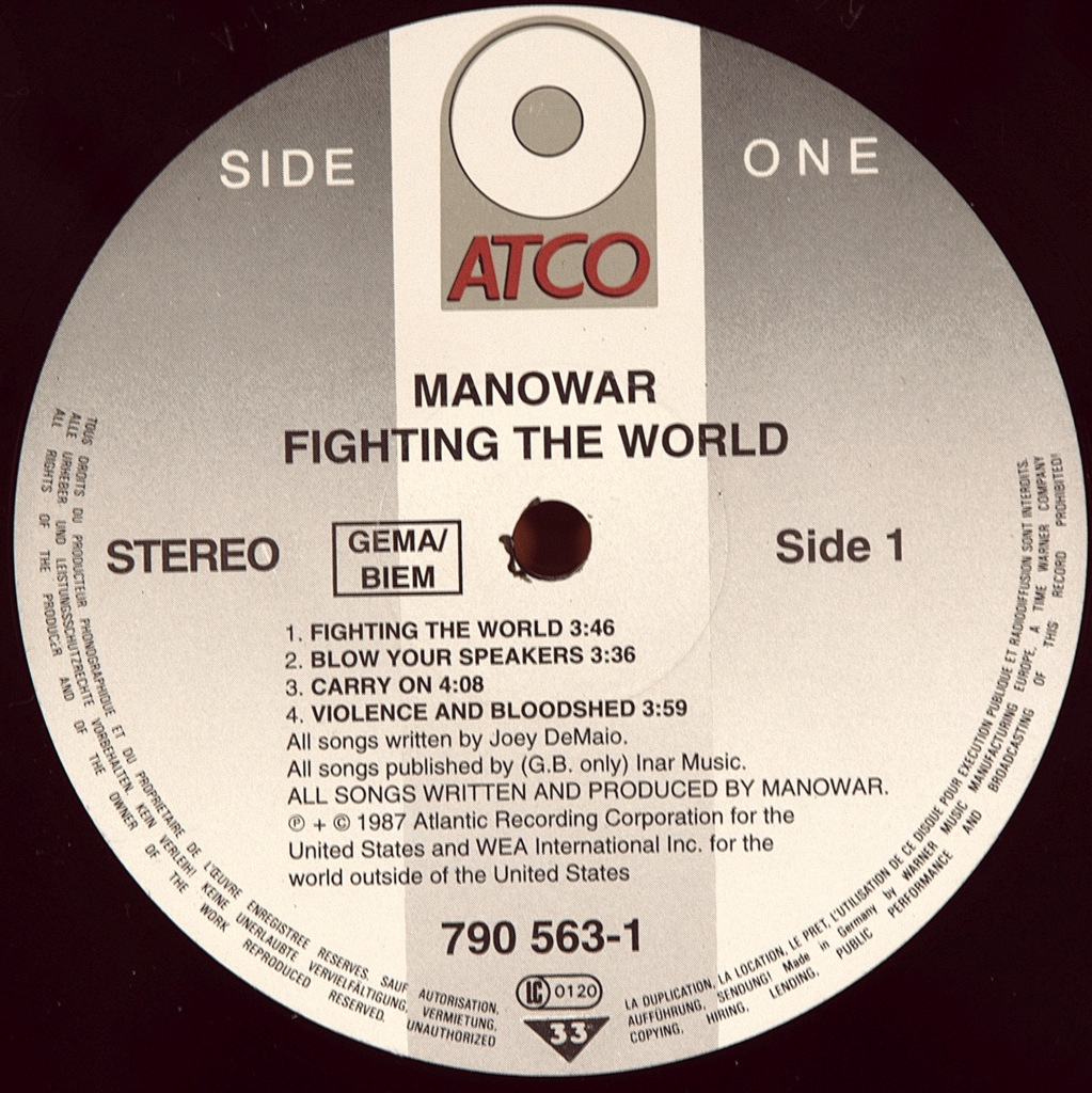 MANOWAR-FIGHTING THE WORLD-1987-FIRST PRESS UK/EU - ATCO-790563-1. A very rare original of the cult heavy metal band. Fighting the World is the fifth Studio album by American heavy metal band Manowar, released in 1987. The CD includes the song "Defender", which was recorded in 1982 with Director, actor and writer Orson Welles. BVMI certification (Germany) — gold, the band's first album to achieve such success in Germany. The status was granted in 1994.