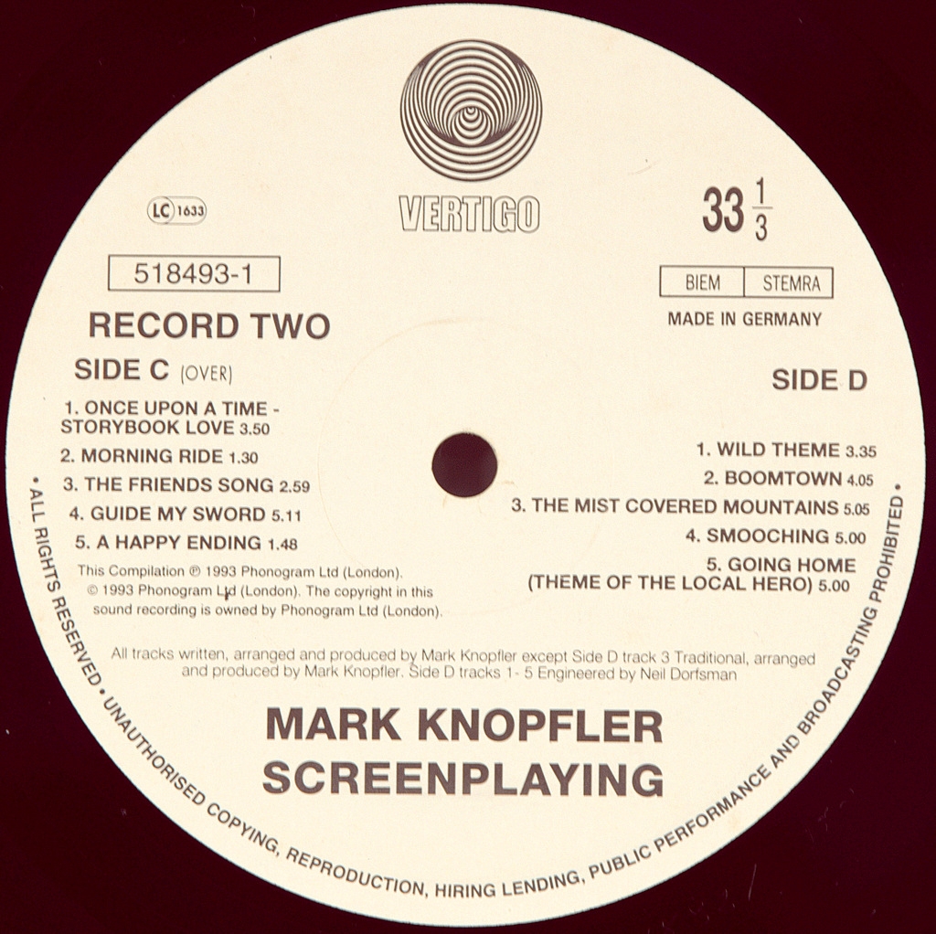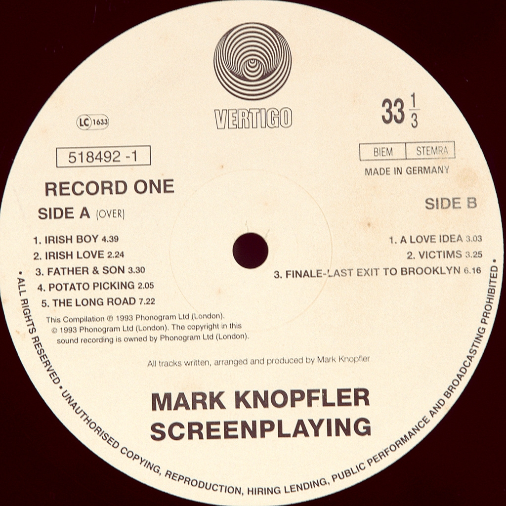 MARK KNOPFLER-SCREENPLAYING(2LP'S)-1993-FIRST PRESS UK/EU GERMANY -VERTIGO SWIRL-518492-1. Very rare original guitarist of DIRE STRAITS.
