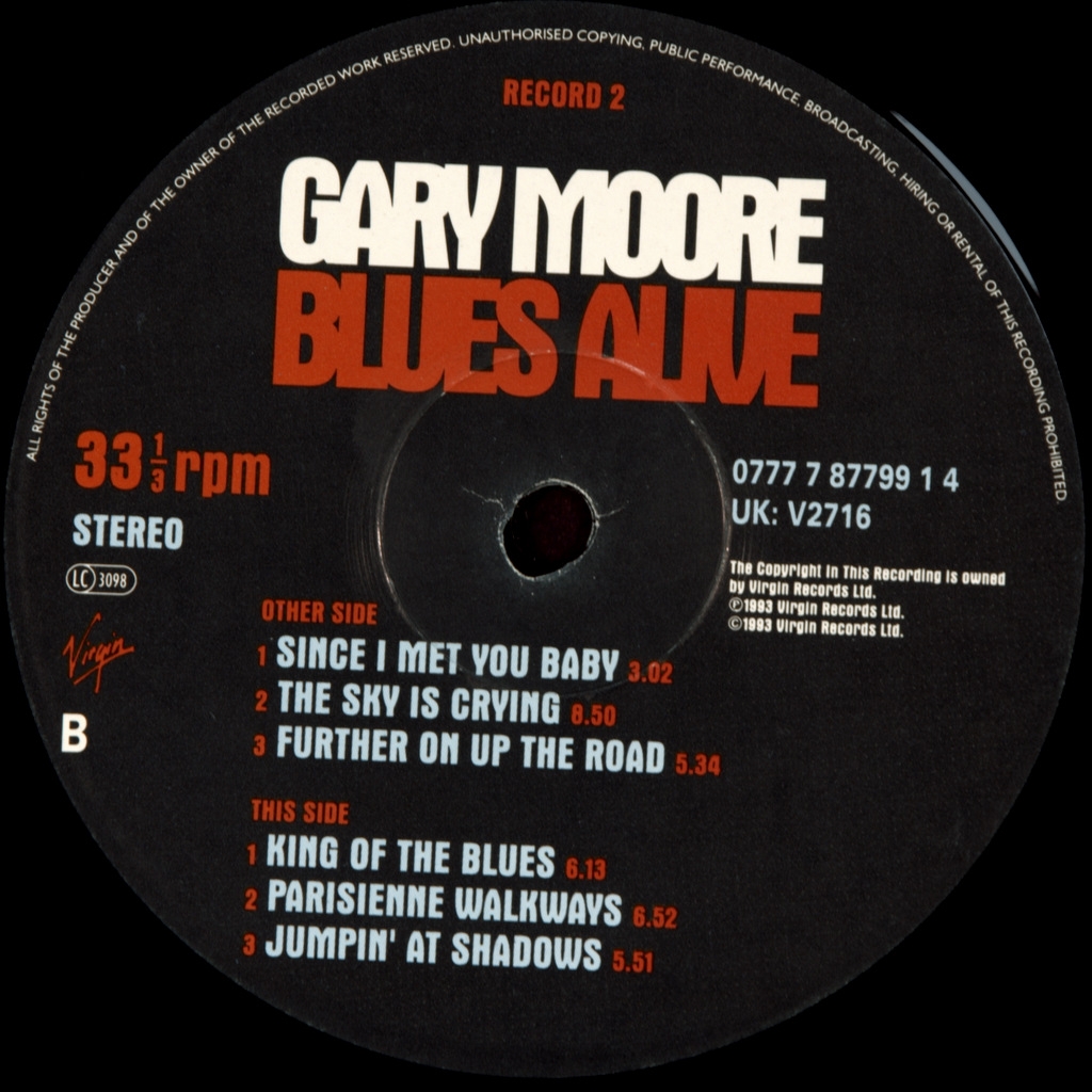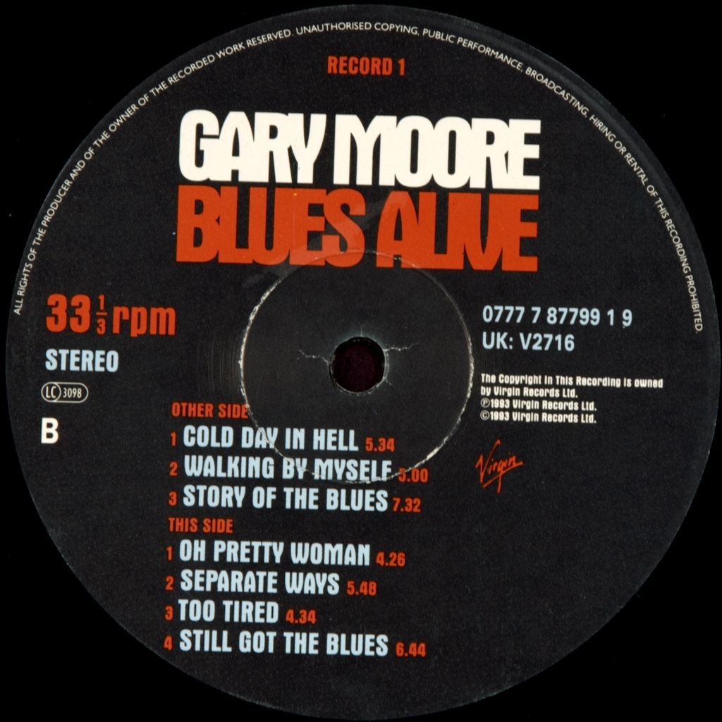 MOORE GARY-BLUES ALIVE (2LP'S)-1993-FIRST UK PRESS-VIRGIN-V2716. Mega rare British limited edition original fully loaded (poster). Blues Alive is a live album by Irish guitarist Gary Moore, released in 1993. The album includes songs recorded during the 1992 various performances as a musician. In the Wake of the surge of interest in the work of a musician from the release of the Blues album "Still Got the Blues" in 1990 and followed him work After Hours, it was decided to release a live album. The records themselves were conducted during the entire world tour 1992. In the end, the musical material of the disc is made up of songs performed at the Universal Amphitheatre Los Angeles (20.05.1992), Paris, Le Zénith (13.06.1992) and London arenas Hammersmith Odeon and the Royal Albert Hall (08.06.1992 and 05.10.1992 respectively). In the accompanying part of The Midnight Blues Band that accompanied Moore's all over the world tour, includes musicians who worked with him on the last two Studio albums. Also on the concerts attended as special guest the famous Blues guitarist albert Collins. Recording of the song "Too Tired" with his participation was included in the final release of the disc. It was the third in a row manifestation of joint creativity — before Collins, in the same capacity, was involved in Still Got the Blues and After Hours. The majority of this live album, couched in a Blues style, made up songs of a similar style disc 1990, 1992 and several cover versions of the classics of this genre of music. Top chat rooms Europe the album was 14 weeks.