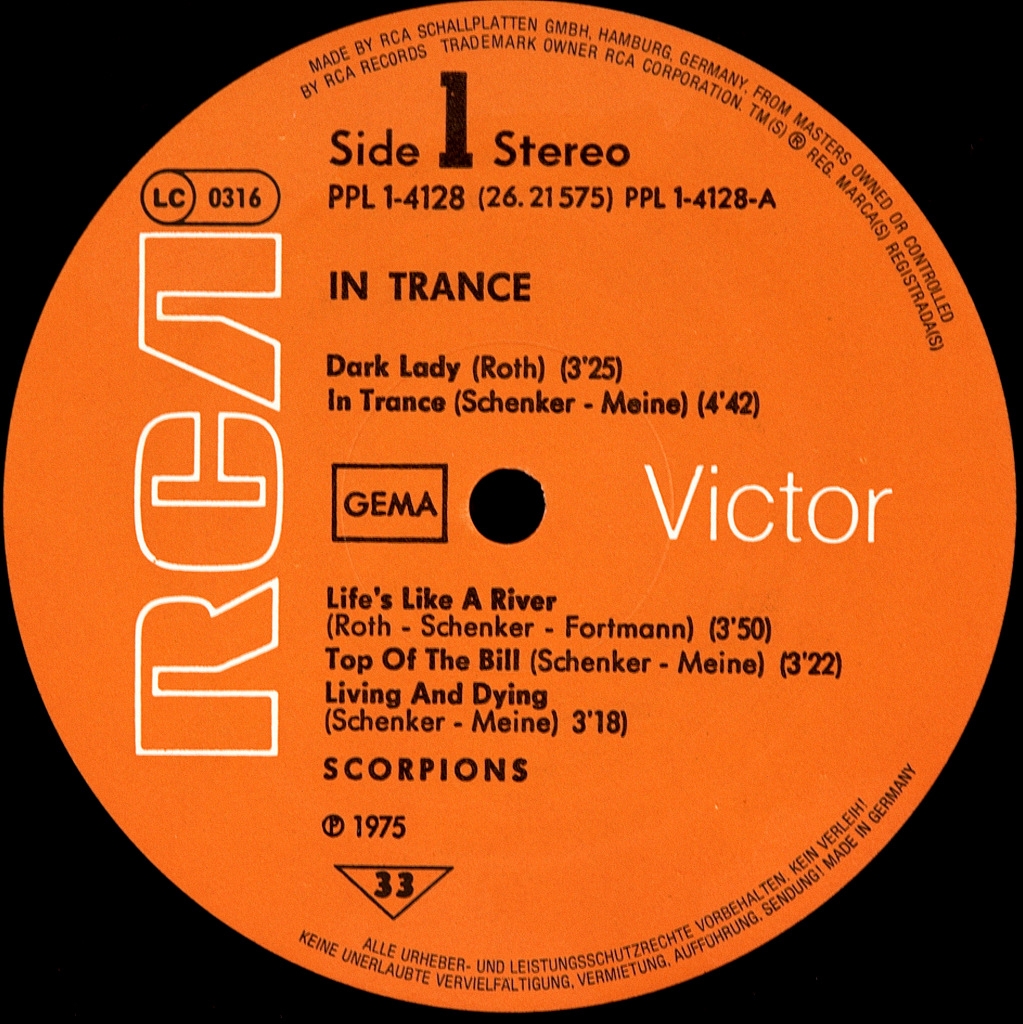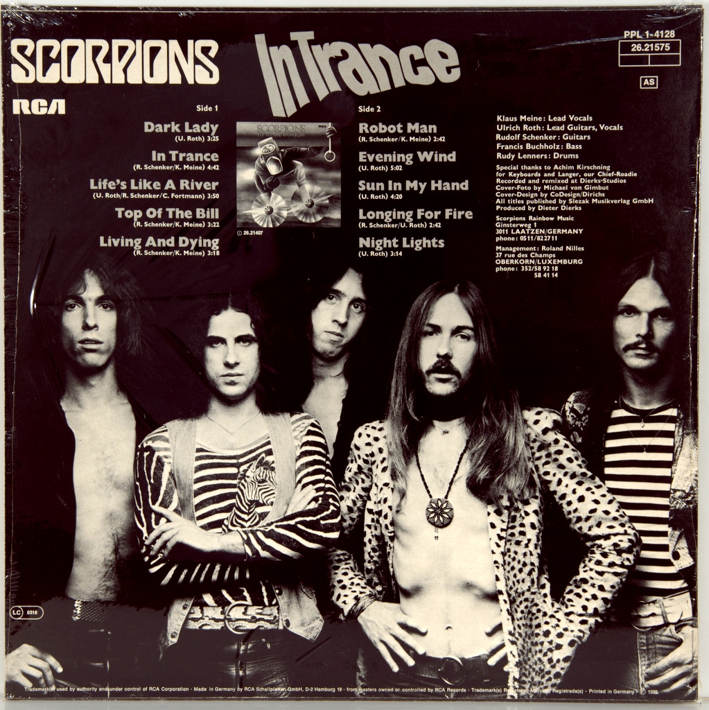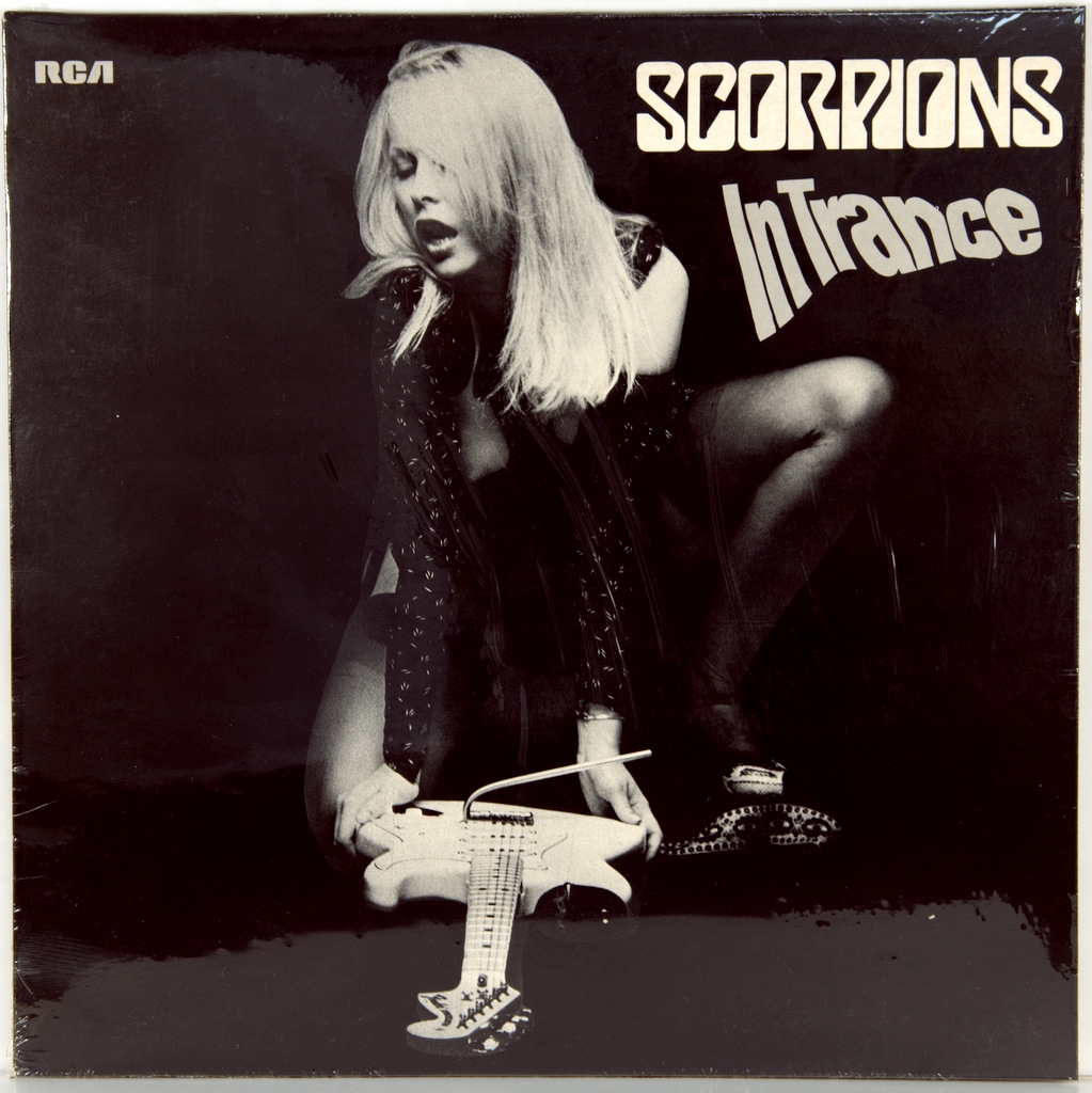 SCORPIONS-IN TRANCE-1975-ORIGINAL PRESS 1976 GERMANY-RCA PPL1-4128. Very rare early edition of the third cult album SCORPIONS. In Trance is the third Studio album . On this album the band developed their hard rock style, which are subsequently modified with the arrival of Matthias ABSA, "brand" — powerful ballads.. the album was attended by: Klaus meine — vocals; Ulrich Roth — guitar, vocals; Rudolf Schenker — guitar, vocals; Francis Buchholz — bass guitar; Rudy Lenners — drums. As a session musician was made by the keyboardist Achim Kirking. It was the first commercially successful album.It is noteworthy that on the cover of the album was submitted to new logo group, which with minor modifications remained in it until today. The original version of the album cover included a photo of the model with a slightly open chest. This led to criticism and accusations by the censors. The foreground was greatly lightened, and the background was radically black. In subsequent editions of the group foreground images had to darken, hiding the chest and the background lightened for contrast.