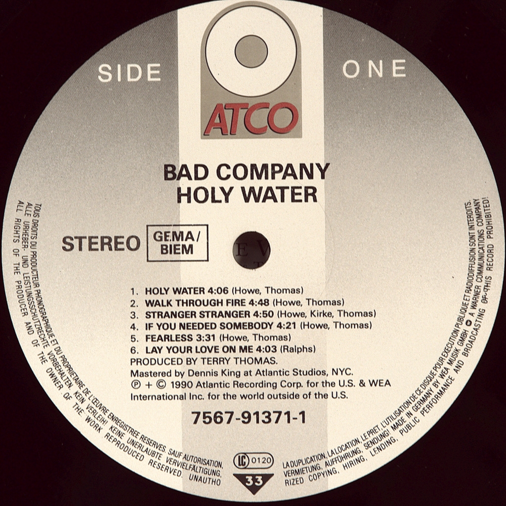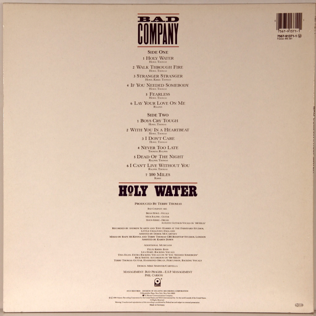BAD COMPANY-HOLY WATER-1990-FIRST PRESS UK/EU-GERMANY-ATCO-7567-91371-1. Holy Water is the ninth Studio album by British hard rock band Bad Company and the third with Brian Howe as lead vocalist. The album was released June 12, 1990. It went platinum, selling over 1,000,000 units, and climbed to No. 35 in the Billboard Top Pop Albums chart. The first single, "Holy Water" was No. 1 on the Billboard album rock track for two weeks during the summer of 1990. The single "If You Needed Somebody" became a major hit in early 1991, reaching No. 16 on the Billboard Hot 100 and # 2 On the album Rock Tracks chart. "Boys Cry Tough "(#3)," Stranger, Stranger "(#9) and" Walk Through Fire " (#28 Hot 100 / #14) also received high marks.