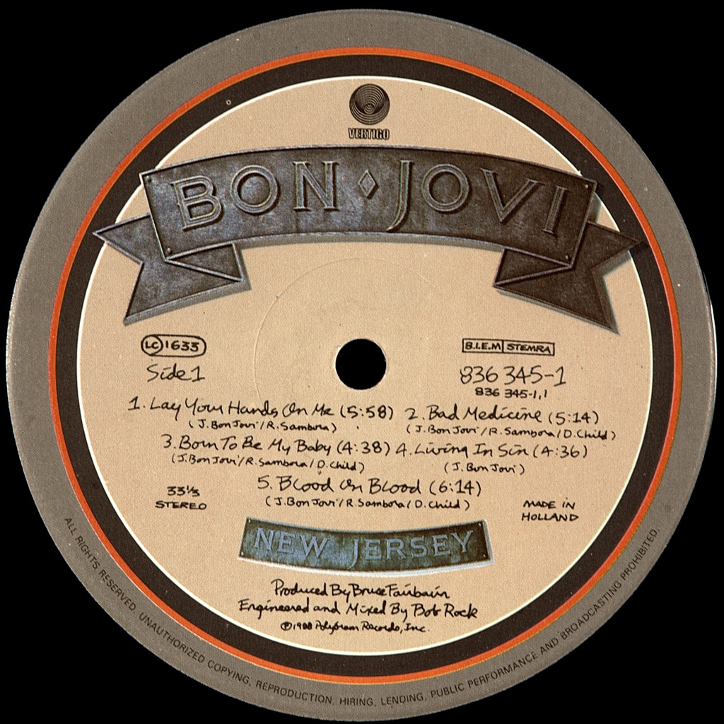 BON JOVI-NEW JERSEY-1988-FIRST PRESS HOLLAND-VERTIGO - 836345-1. Rare European original. New Jersey is the fourth Studio album by American rock band Bon Jovi, released on 19 September 1988. The album reached 1 on the Billboard 200. New Jersey was especially noted for the fact that it was released on 5 singles in the top ten of the Billboard Hot 100, the most top 10 singles from a hard rock album. The album got platinum certificate 7 times in the US and twice in the UK. In 2002, the album was ranked 80-th place in the rating "100 best rock albums of all time" by the magazine Classic Rock.