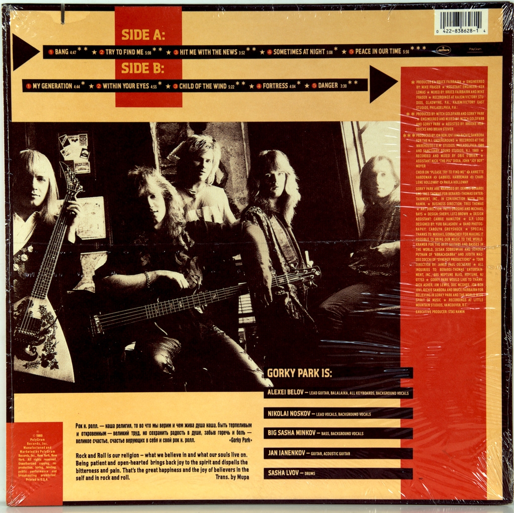 GORKY PARK (GORKY PARK) GORKY PARK (GORKY PARK)- 1989 - FIRST PRESS USA-MERCURY-838628-1. Gorky Park is the debut album by Soviet glam metal band Gorky Park. Was released in August 1989. In August 1989 Gorky Park release their debut self-titled album. His support in new York was filmed for the song "My Generation" and "Bang". The single "Bang" hit the "top 15" on American MTV and stayed there for two months, reaching 3 lines. The single "Try to Find Me" made it to position 81 on the Billboard Hot 100, making Gorky Park the first Russian band, caught in the American national chart. The album itself got to 80 on the Billboard 200 for three weeks from the start of sales which has a circulation more than 300 thousand copies.