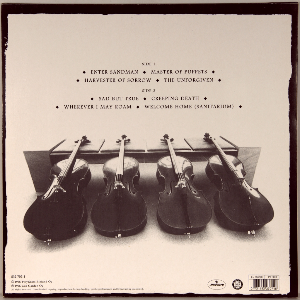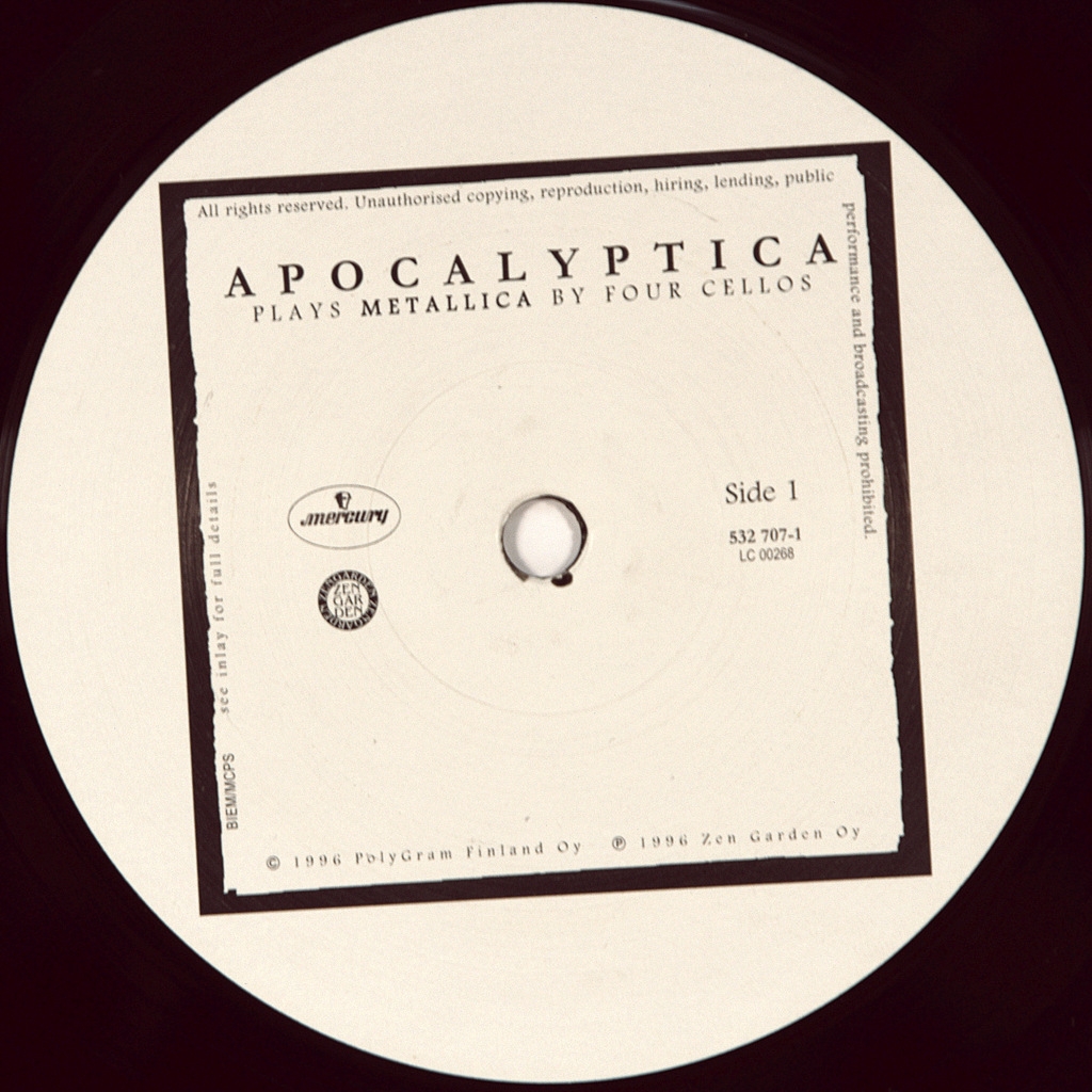 APOCALYPTICA-PLAYS METALLICA-1996-FIRST PRESS UK/EU-POLYGRAM-532707-1. Very rare original Finnish group.Plays Metallica by Four Cellos is the debut Studio instrumental cover album of Finnish band Apocalyptica, released in 1996. In Plays Metallica by Four Cellos contains eight instrumental cover versions of songs by Metallica. The album is highly appreciated by critics and audience. ALLMUSIC rated the album 3 stars.