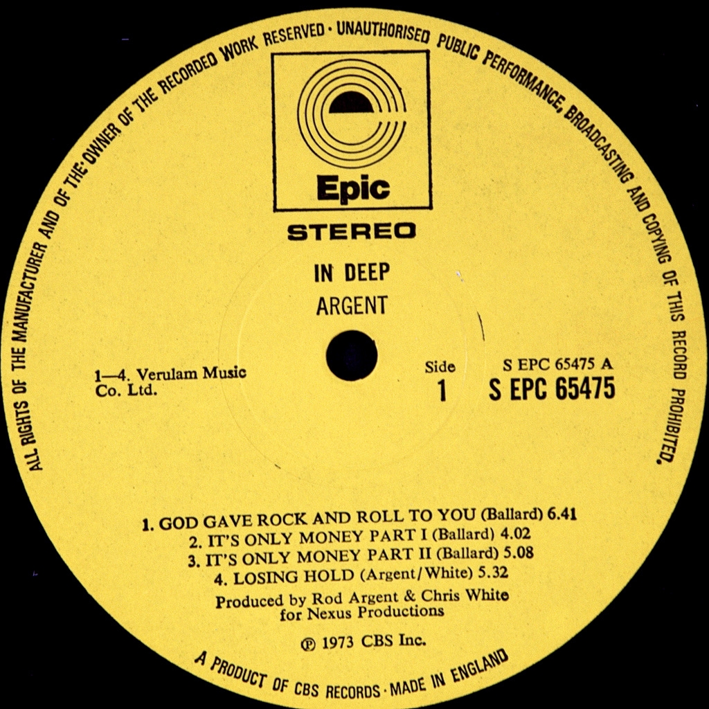 ARGENT-IN DEEP-1973-FIRST UK PRESS-EPIC-EPC65475. Of The Matrix A-1/B-1 Porky/Pesco. Rare British original prog band from England.In Deep is the fourth Studio album by Argent, originally released on Epic Records in 1973. It is the original full-length recording of "God Given Rock and Roll to You", which reached number 18 in the UK charts (U.S. No. 114), when it was released in edited form as a single later that year. Later it was remade by Kiss as "God gave rock and roll to you II" for the film Bill & Ted's Bogus Journey in 1991.