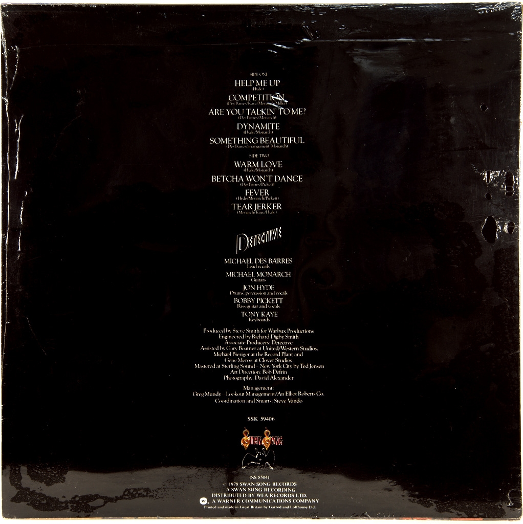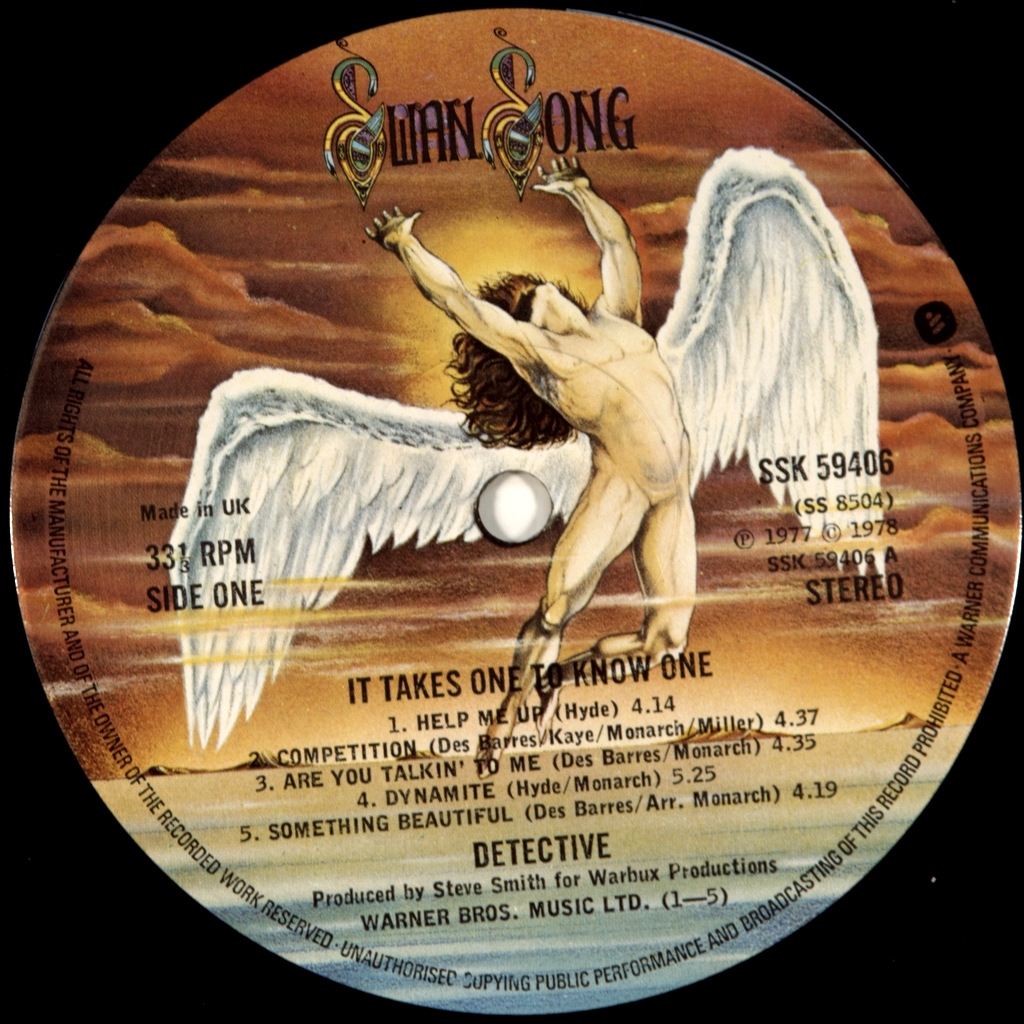 DETECTIVE-IT TAKES ONE TO KNOW ONE-1978-FIRST UK PRESS-SWAN SONG-SSK59406. Of the matrix A-1/B-1 ALLEN. One of the interesting supergroups of the second echelon DETECTIVE came to the US in 1975, although its members were British. The founder of the band, keyboardist Tony Kaye (the Top Kauai) in the summer of 1968 became the co-founder of YES. The group invited Pete banks FLASH and BADGER. guitarist Michael Monarch (Michael Monarch) of STEPPENWOLF,the bass guitarist SUGARLOAF Bobby Pickett (Bobby Pikett), and Studio drummer John Hyde (Jon Hyde), although he did not play in the popular groups, but the reputation of the American Bonzo, the drummer of Led Zeppelin.At one of the concerts they saw Jimmy page and invited to his own label, Swan Song. The DETECTIVE seemed to him a suitable group and in the autumn of 1976 they signed a contract and first album Paige produced independently.