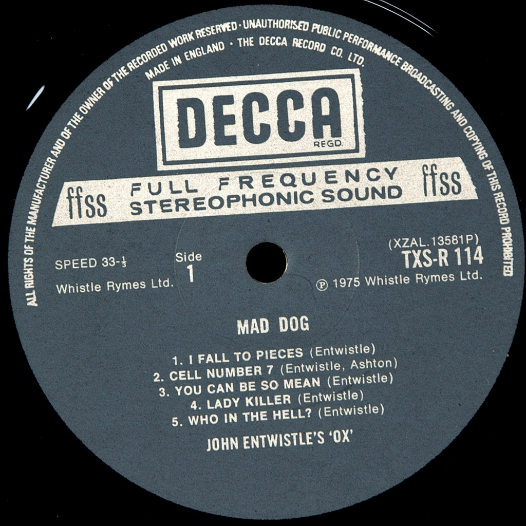 JOHN ENTWISTLE'S 'OX'- MAD DOG-1975 - UK FIRST PRESS-DECCA-TXS-R 114. Of The Matrix A-1/B-1. Very rare British original as a complete set ( large poster 95 cm x 65 cm) bass guitarist and vocalist of the legendary band THE WHO. Mad Dog is the fourth solo Studio album from The Who bassist John Entwistle, and also his last for six years and the debut album from his band John Entwistle's Ox.