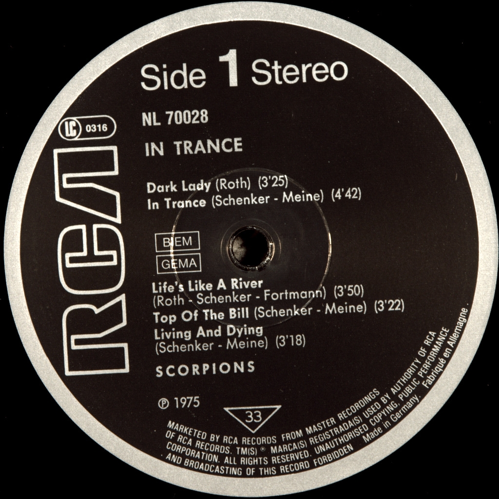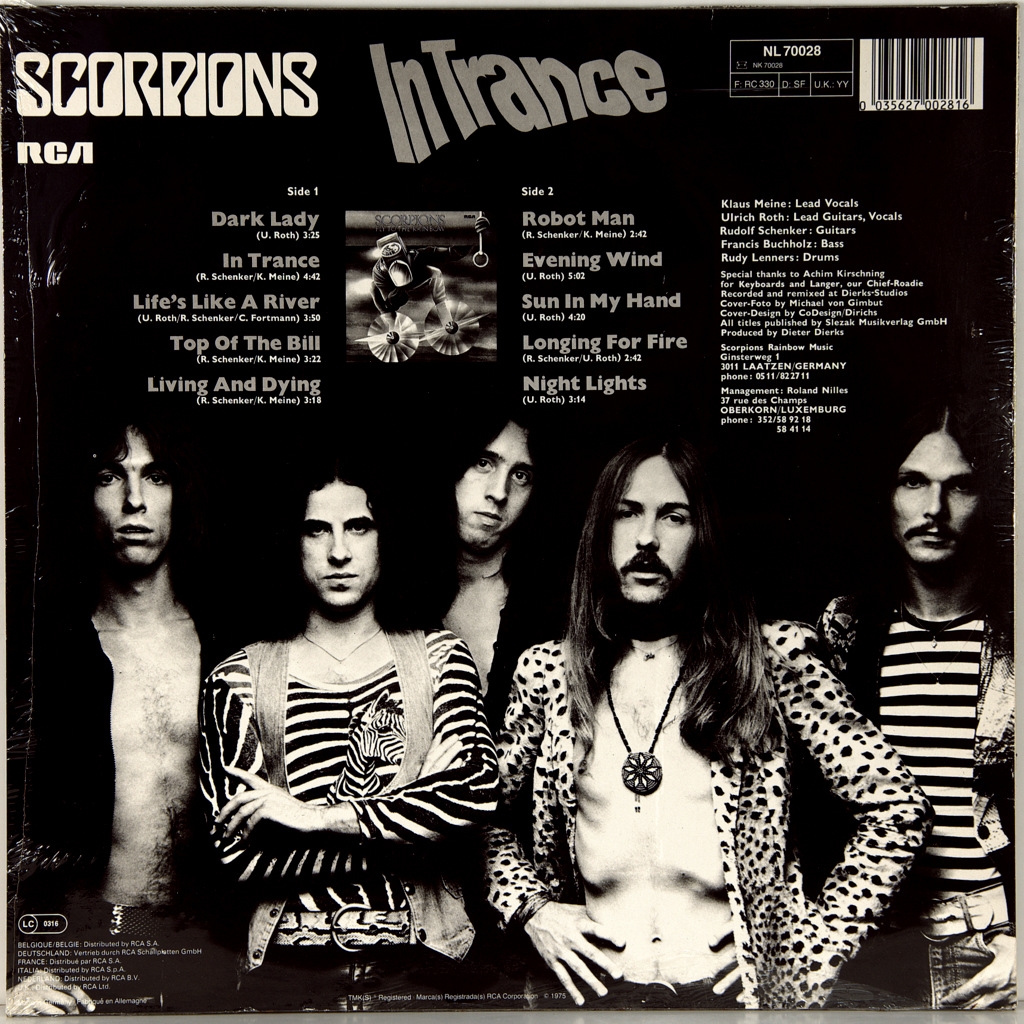 SCORPIONS-IN TRANCE-1975-ORIGINAL PRESS 1985 GERMANY-RCA-NL70028. Rare early edition of the 80s cult third album SCORPIONS. In Trance is the third Studio album . On this album the band developed their hard rock style, which are subsequently modified with the arrival of Matthias ABSA, "brand" — powerful ballads.. the album was attended by: Klaus meine — vocals; Ulrich Roth — guitar, vocals; Rudolf Schenker — guitar, vocals; Francis Buchholz — bass guitar; Rudy Lenners — drums. As a session musician was made by the keyboardist Achim Kirking. It was the first commercially successful album.It is noteworthy that on the cover of the album was submitted to new logo group, which with minor modifications remained in it until today. The original version of the album cover included a photo of the model with a slightly open chest. This led to criticism and accusations by the censors. The foreground was greatly lightened, and the background was radically black. In subsequent editions of the group foreground images had to darken, hiding the chest and the background lightened for contrast.