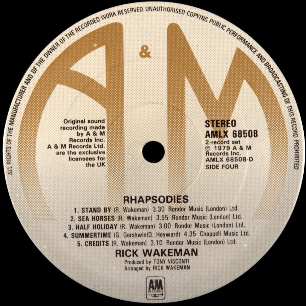 WAKEMAN, RICK-RHAPSODIES-1979-FIRST UK PRESS-A&M - AMLX68508. Matrix A-3/B-3/C-3/D-4. Rare British original cult keyboardist of progressive music. "Rhapsodies" (Rhapsody) - the 8th album by Rick Wakeman (double), includes Rhapsody works as the Rick and some other authors. Recorded this album in 1978 and early 1979 in a home Studio Wakeman "La Grange Studios", as well as in Switzerland, in the Studio, "Mountain Studios" (Montreux). Produced by Tony Visconti (previously worked with David Bowie, Marc bolana group "sparks"), he played acoustic guitar. The release took place in may 1979 on the label of A&M. Critics praised this album's different, but relatively low compared to previous albums. Sam Wakeman said that he did not plan to create something outstanding, he just tired from the countless tours with the band "Yes" and decided to relax, doing exactly the music which he at that moment was like. Immediately after the release, he terminated the contract with A&M, and the following album was released on Charisma Records.