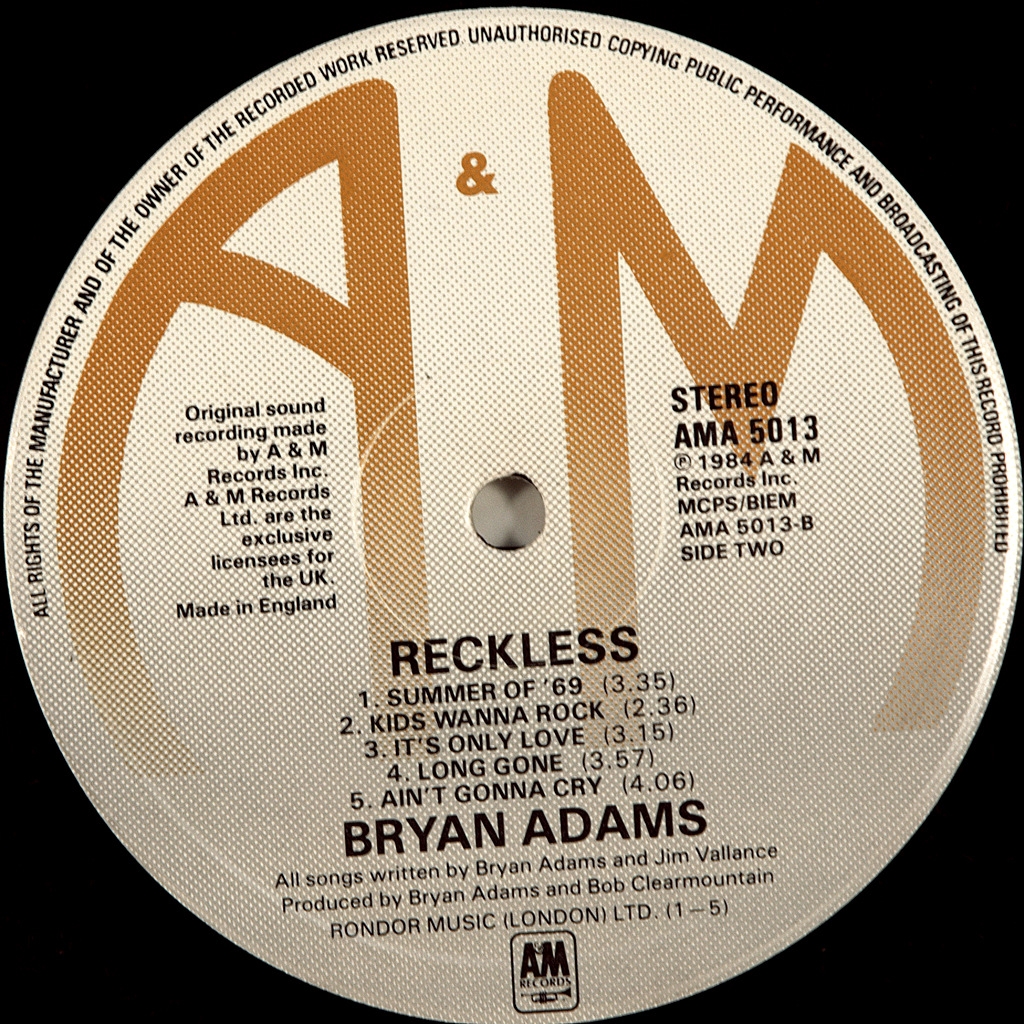 ADAMS, BRYAN-RECKLESS-1984-FIRST UK PRESS-A&M-AMA5013. Rare British original. Reckless is the fourth Studio album by canadian singer and songwriter Bryan Adams. Released on 5 November 1984 on the label A & M, this album was produced by Adams and Bob Clearmountain, and it was, perhaps, the most successful solo album, Adams. The album was a huge international hit, sold over five million copies only in the United States and twelve million worldwide. It was the first canadian album, which has sold over a million copies in Canada. The album ranked first on the Billboard 200 and reached the top positions in the charts of albums worldwide.