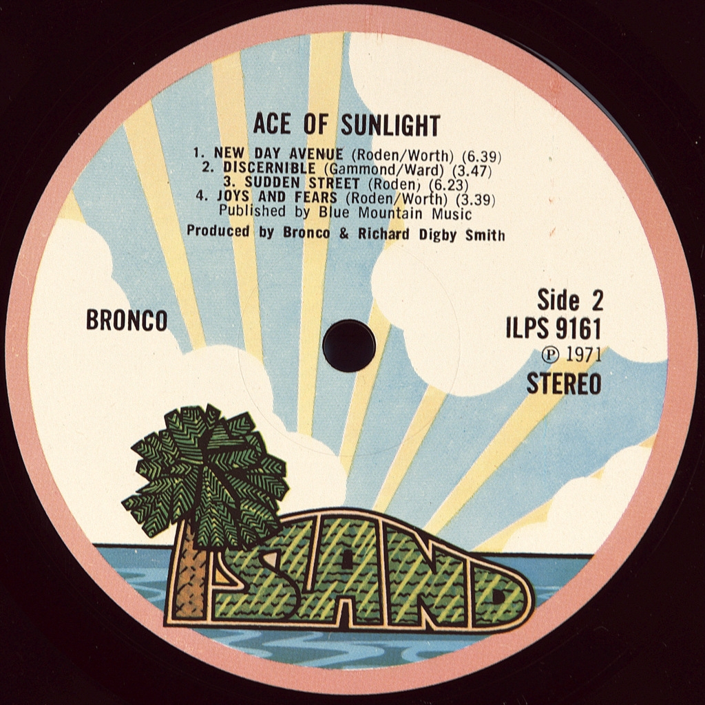 BRONCO-ACE OF SUNLIGHT-1971-FIRST UK PRESS-ISLAND-ILPS9161.Matrix A-1U/B-1U . Stamper 1GA/1GR (Very early). Very rare original British prog-Blues psychedelia. The group was formed in late 1969 by vocalist Jess Roden, after his departure from The Alan Bown Set. In General, the group is associated with its roots by Led Zeppelin. After all, Kevyn Gammond, Lockey and Paul John Pasternak participated in the first group, Robert Plant and John Bonham - Band of Joy. Bronco were signed to Island Records and released two albums "Country Home" and "Ace of Sunlight". Roden left the band in mid-1972. They released three albums during their existence, Country Home (1970) Ace of Sunlight (1971) and Smoking Mixture (1973).