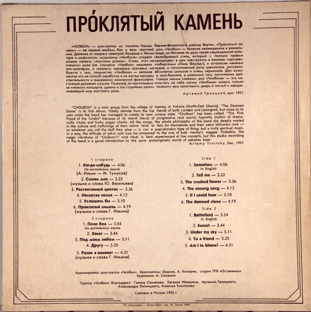 CHOLBON – CURSED STONE-1992-FIRST PRESS RUSSIA-RGM-RGM7057. Mega rare original Russian rock band. "Cursed stone" is a Studio album recorded Yakut rock band "Cholbon" in 1992 and released by RGM (Russian German Music) to the LP format with a circulation of 10,000 copies. The most famous on the album "Cursed stone" is the song "someday." the lyrics for which was written by Michael Tumusov, it was written in the early period of the band when Cholbon was performed under the name "Cantik". On the back of the album cover posted abstract music critic Artemy Troitsky, in which he compares the music of the band Cholbon with the music of Pink Floyd and calls it "spiritual music".