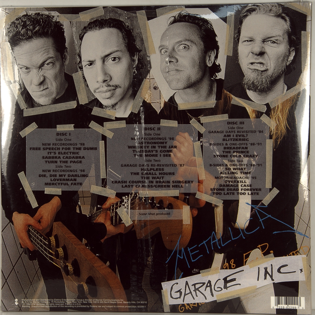 METALLICA-GARAGE INC. (3LP)-1998-FIRST PRESS USA-ELEKTRA-62299-1. Mega rare original the cult triple album. Garage Inc. album band Metallica, released in 1998, which is a collection of cover versions of songs of different groups. The album songs musicians of various genres that have somehow influenced the work of the group, or were of great importance for the participants. These included songs of the pioneers of metal such as Black Sabbath, Diamond Head, Blue Öyster Cult, Thin Lizzy and more rocking southern sound of Bob Seger and Lynyrd Skynyrd. Using of songs from the first album from Mercyful Fate, Melissa (1983) the band recorded a medley that included in the album under the name Mercyful Fate. Cover Discharge and the Misfits introduced hardcore punk component. By August 2013 the album has sold around the world sold more than 6 million copies.