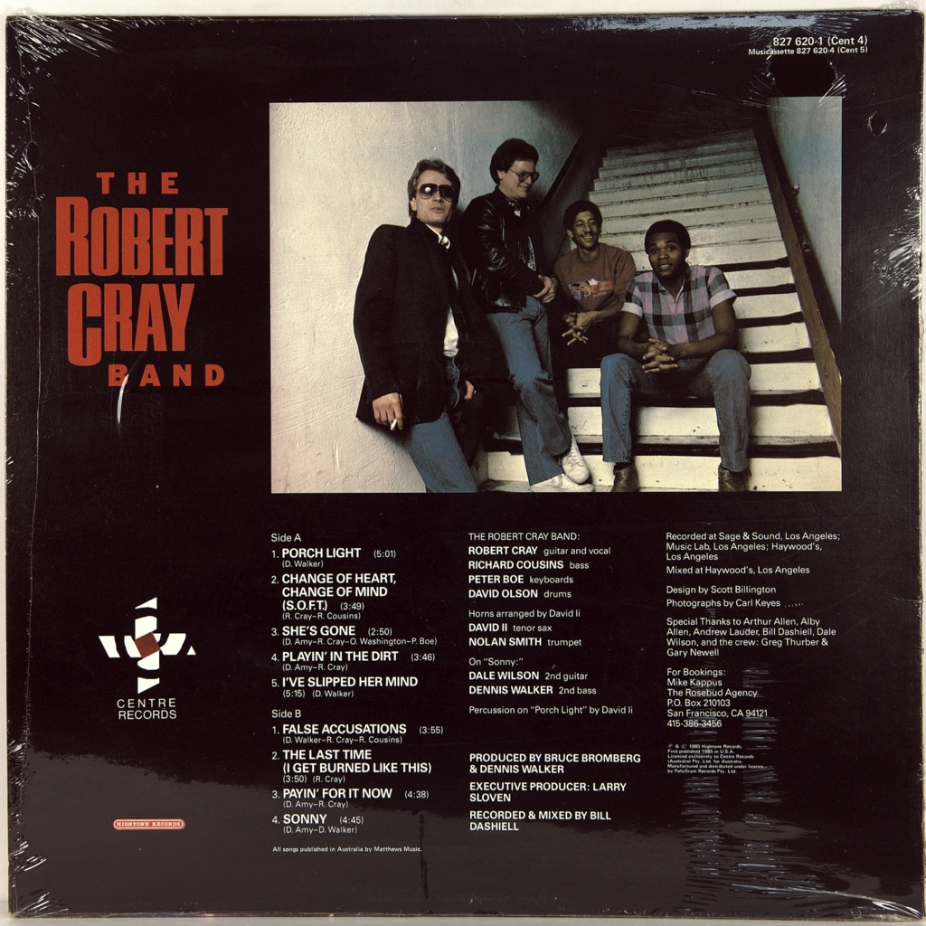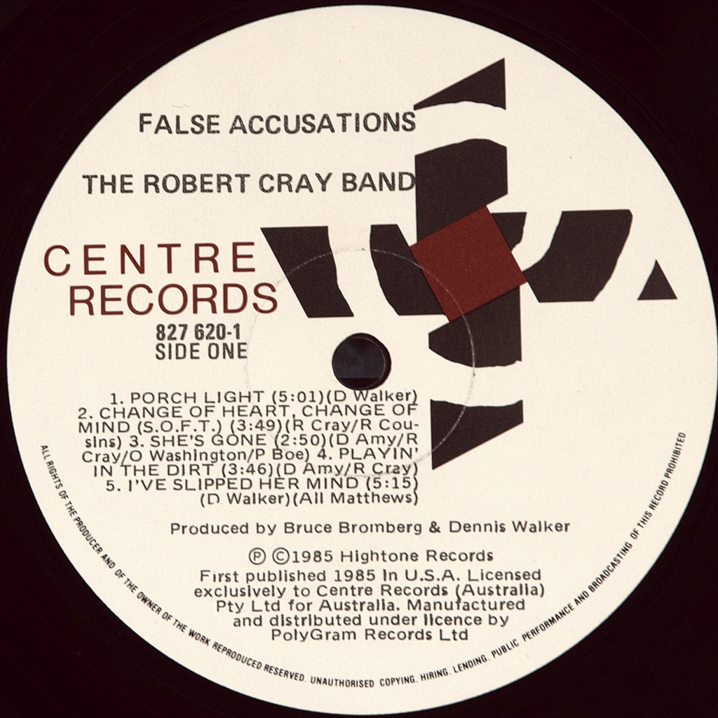 ROBERT CRAY BAND-FALSE ACCUSATIONS-1985-AUSTRALIA FIRST PRESS-CENTRE-827620-1. Rare original Blues stars of the ' 80s. William Robert Cray is an American Blues guitarist and singer . He led his own group and won five Grammy awards. False Accusations is the third Studio album by The Robert Cray Band released in 1985.