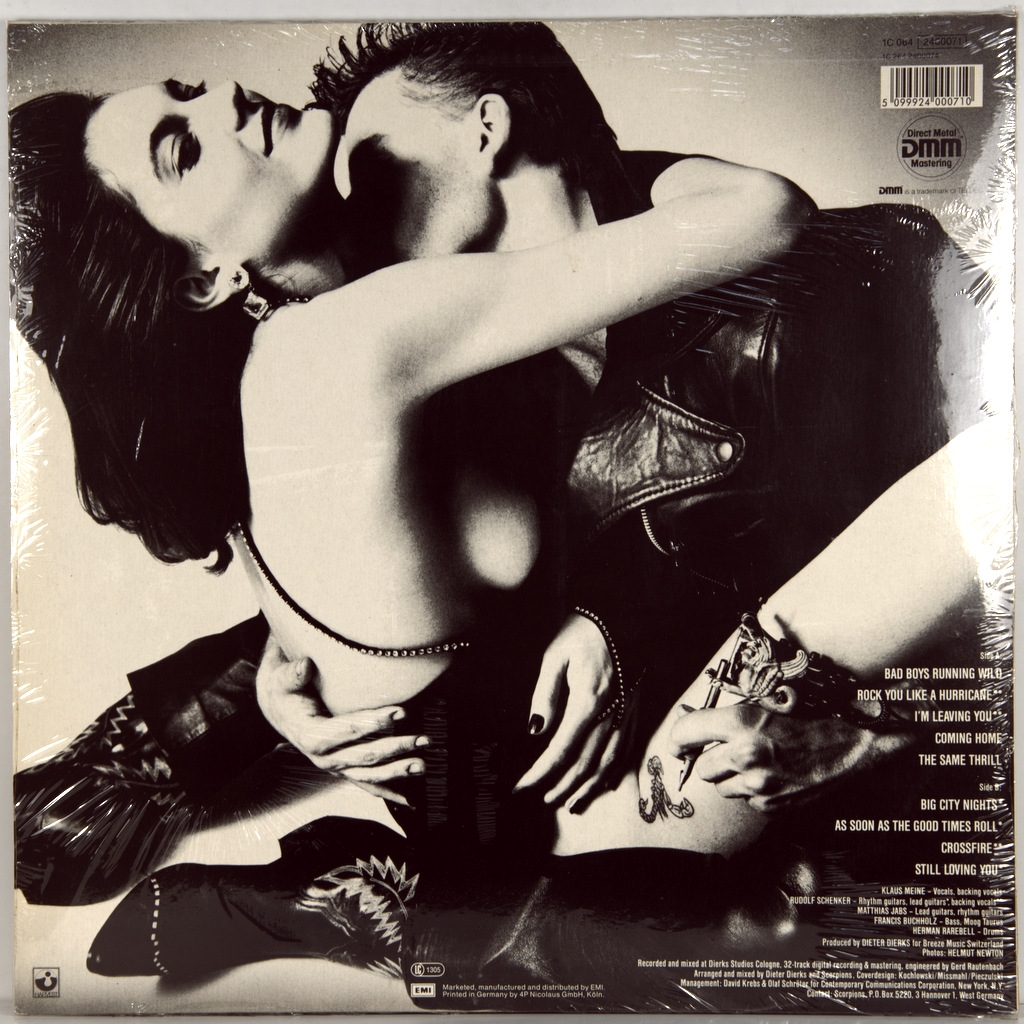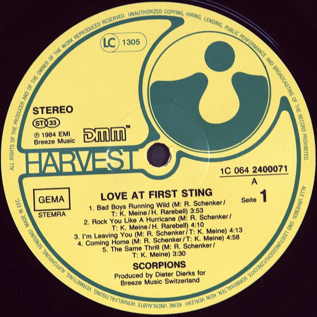 SCORPIONS-LOVE AT FIRST STING-1984-FIRST GERMANY PRESS-HARVEST-1C 064 2400071. Love at First Sting is the ninth Studio album by the German rock band Scorpions, released in 1984. Love at First Sting became one of the most successful albums in the history of their career; in America, the album became platinum. Includes such well-known hits of the Scorpions as "Rock You Like a Hurricane", "Bad Boys Running Wild", "Coming Home", "Big City Nights", as well as one of their most famous rock ballads "Still Loving You". Critics enthusiastically welcomed this album. Magazine Rolling Stone called Scorpions "the heroes of heavy metal". The ballad "Still Loving You", written in 1976 and released only in 1984, became an international rock anthem.