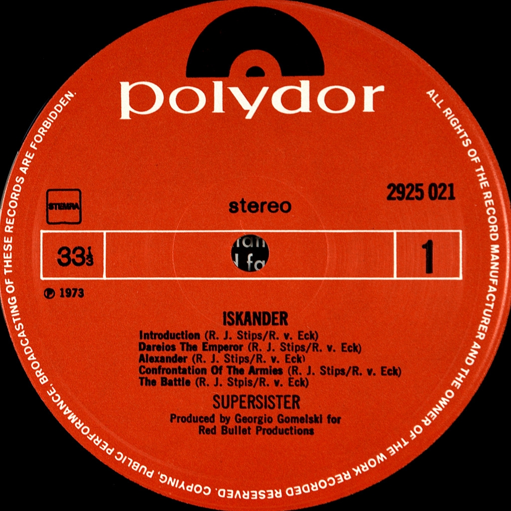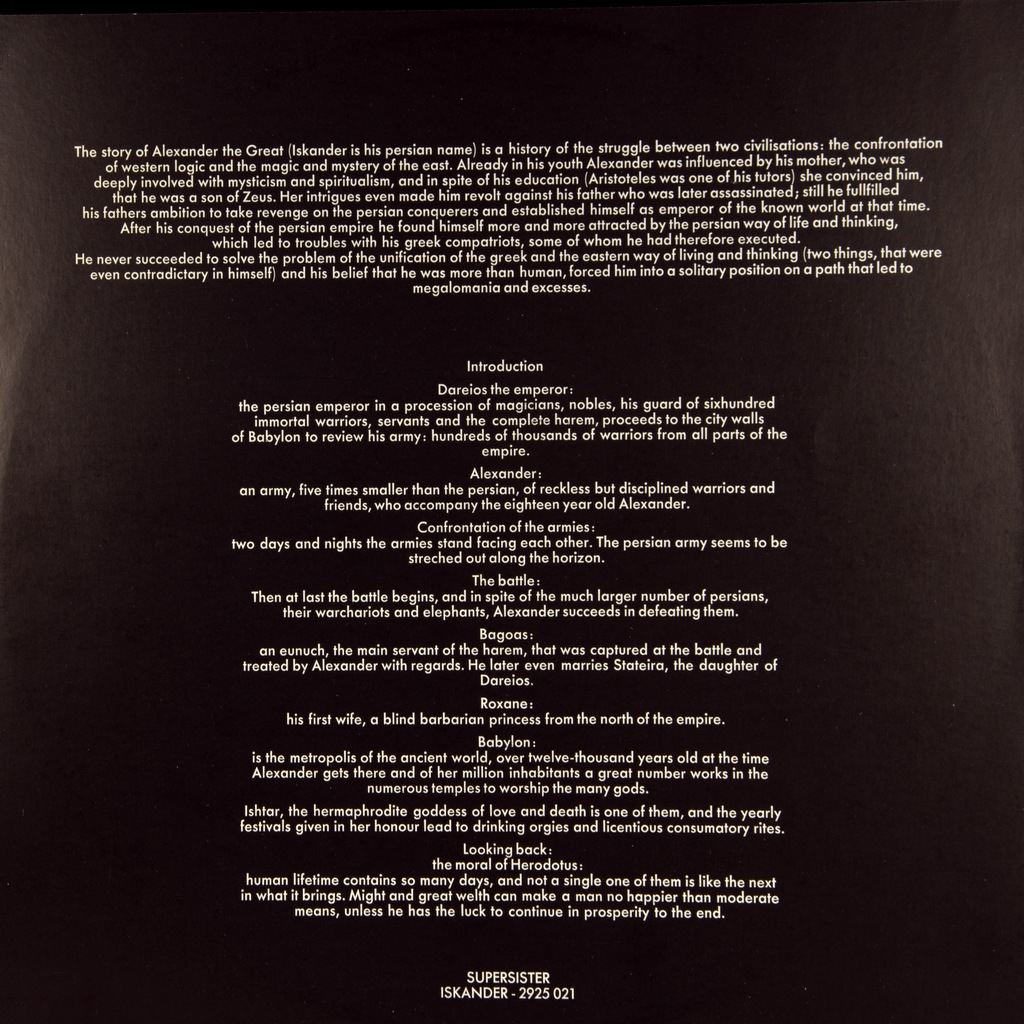 SUPERSISTER-ISKANDER-1973-FIRST HOLLAND PRESS-POLYDOR-2925021. Mega rare original cult prog group. Supersister: a Dutch progressive rock group with a wide range of music from jazz to pop. The first three albums included in the list of 40 best albums of the Canterbury scene, created the site Progarchives.com. In 1973 Van Geest and Vrolijk quit the band, they were replaced by Charlie Mariano (wind instruments) and Herman van Boeyen (drums). In the new structure, the group released the conceptual jazz-rock album Iskander (1973), which was based on the life story of Alexander the great.