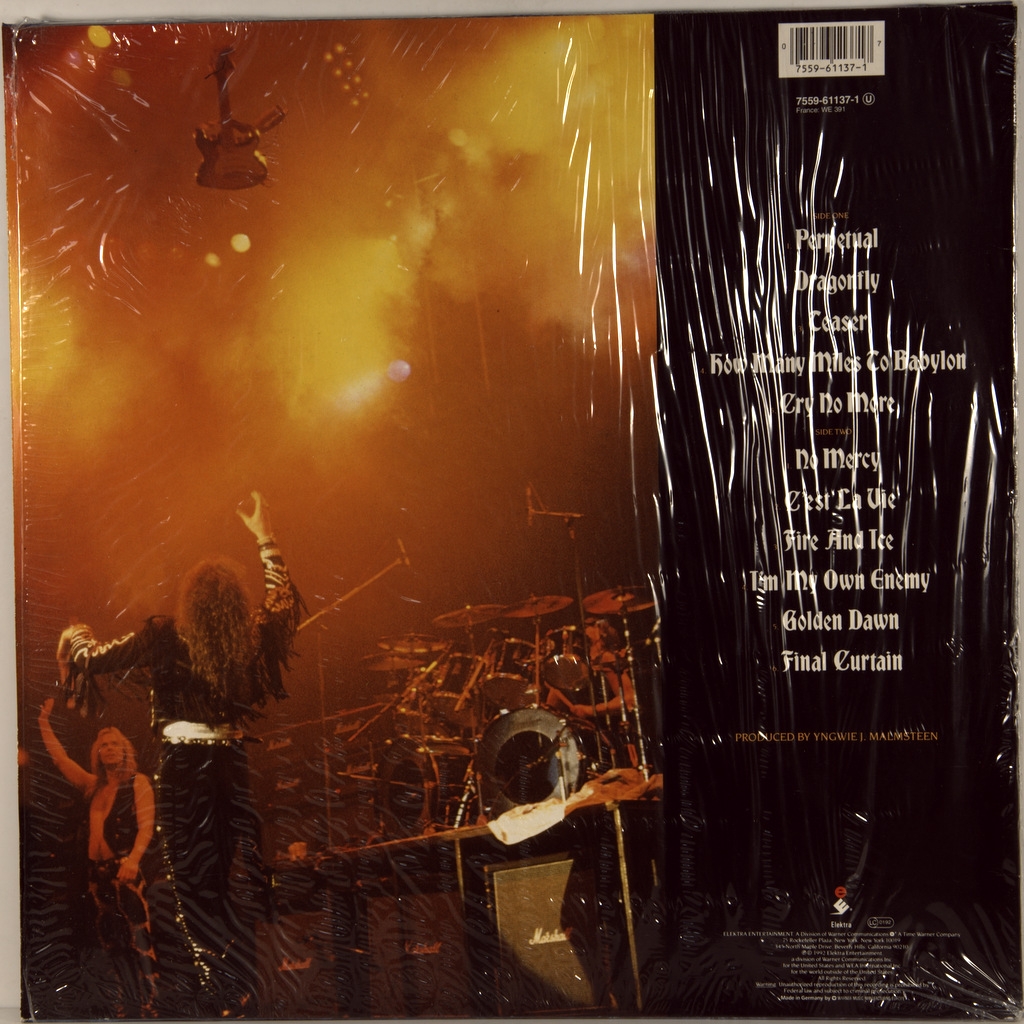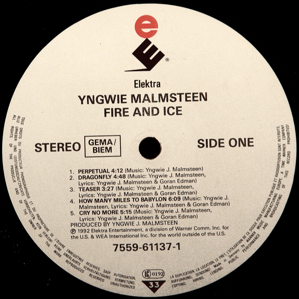 MALMSTEEN, YNGWIE-FIRE & ICE-1992-FIRST PRESS UK/EU-GERMANY-ELEKTRA 7559-61137-1. Rare original virtuoso guitar. Fire & Ice is the sixth Studio album by guitarist Yngwie Malmsteen , released on 7 February 1992 on Elektra Records . The album took first place in the Japanese albums chart , reached # 121 on the us Billboard 200 and charted in the top 90 in the Netherlands, Sweden and Switzerland.