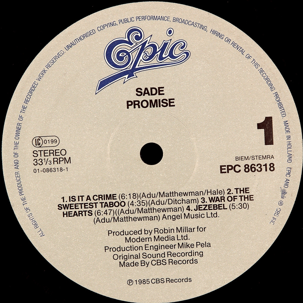 SADE-PROMISE-1985-FIRST HOLLAND PRESS-EPIC- EPC86318. Rare European original. Promise is the second Studio album by Sade. Almost every second song on the album took the top of the billboards ("Is It a Crime" and "Fear"), several songs became hit singles ("Never as Good as the First Time" and "The Sweetest Taboo"). Promise became four times platinum in U.S., double platinum in the UK and Canada and platinum in Germany.