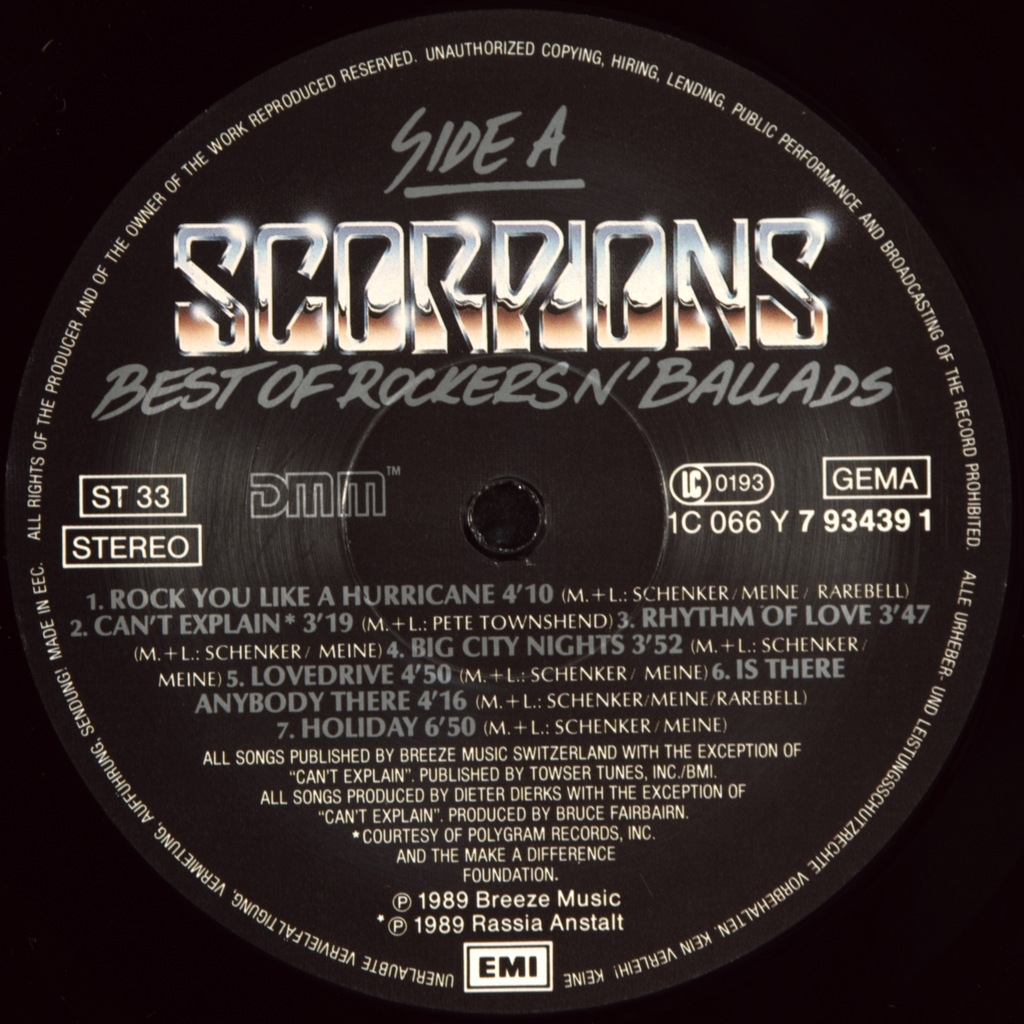 SCORPIONS-BEST OF ROCKERS N' BALLADS-1989-FIRST PRESS GERMANY-EMI-7934391. Rare German original album which includes the best ballad and rock songs from the albums of 1978-1988. Scorpions is a German English-language rock band formed in 1965 in Hanover. The band's style is characterized by both classic hard rock and lyrical guitar ballads.