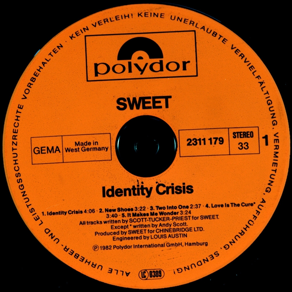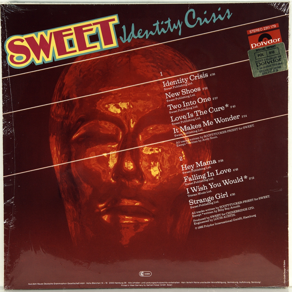 SWEET - IDENTITY CRISIS-1982-FIRST PRESS UK/EU-GERMANY-POLYDOR-2311179. Mega rare original cult band. Identity Crisis - the ninth and final Studio album by British glam rock band Sweet . Originally released only in Germany and Mexico via Polydor , the album was recorded in 1980-81, and finally released after the band's breakup in 1982.