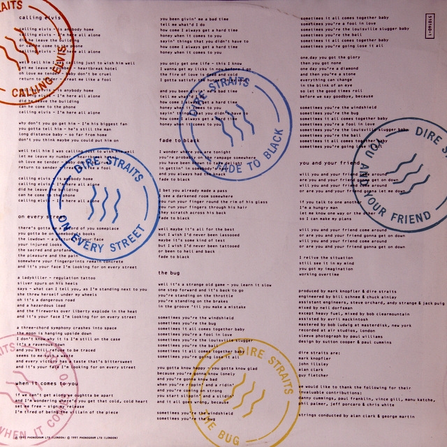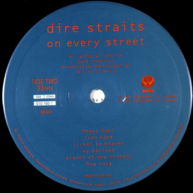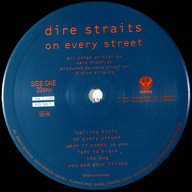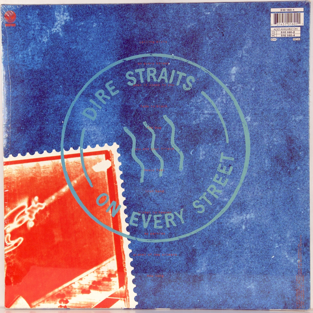 DIRE STRAITS-ON EVERY STREET-1991-First HOLLAND press-VERTIGO - 510160-1 On Every Street is the sixth and final Studio album by British rock band Dire Straits, released in 1991. Reached the highest positions in the UK charts becoming double-platinum. It is worth noting that the album was kept in 20 countries to 44 weeks everywhere received platinum or double platinum, and in France received a diamond status.