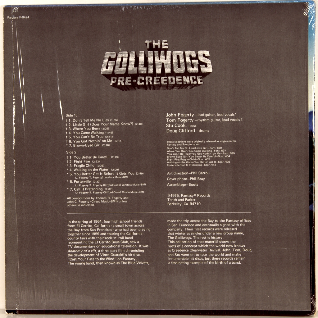 GOLLIWOGS (PRE - CREEDENCE)-SAME-1975-FIRST PRESS USA-FANTASY-F9474. Very rare original group , all members of which changed its name to CREEDENCE CLEARWATER REVIVAL.The album included singles from 1965 to 1967. Golliwogs was an American rock group, which later became Creedence Clearwater Revival .[1] after previously playing as The Blue Underneath (alternative Tommy Fogerty and The Blue Underneath or The Blue Violets), since 1959, the group changed its name to the Golliwogs in 1964. Over the next three years they released a series of singles written by brothers Tom and John Fogerty . They became Creedence Clearwater Revival in 1967, in the embodiment in which they are to enjoy commercial and critical success.