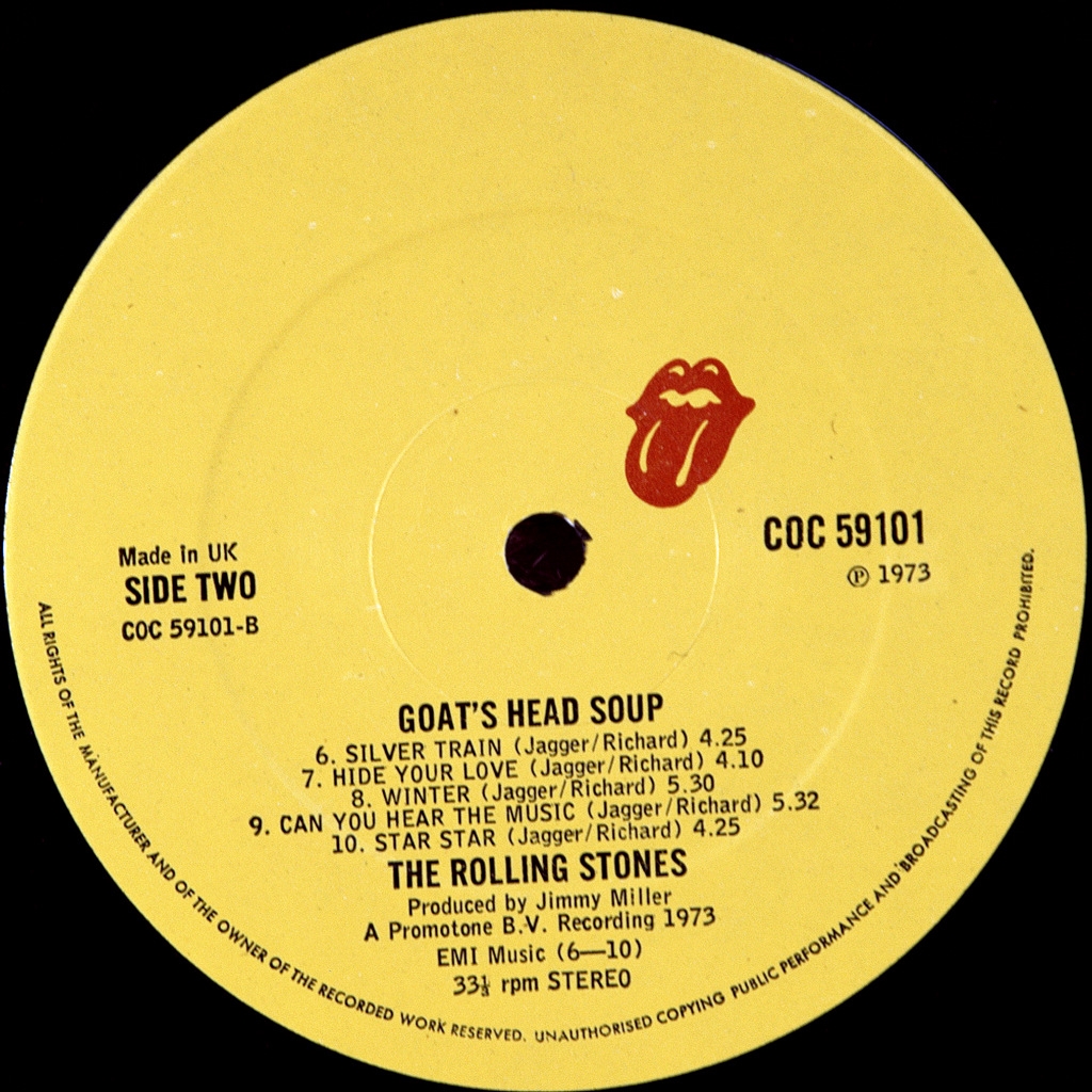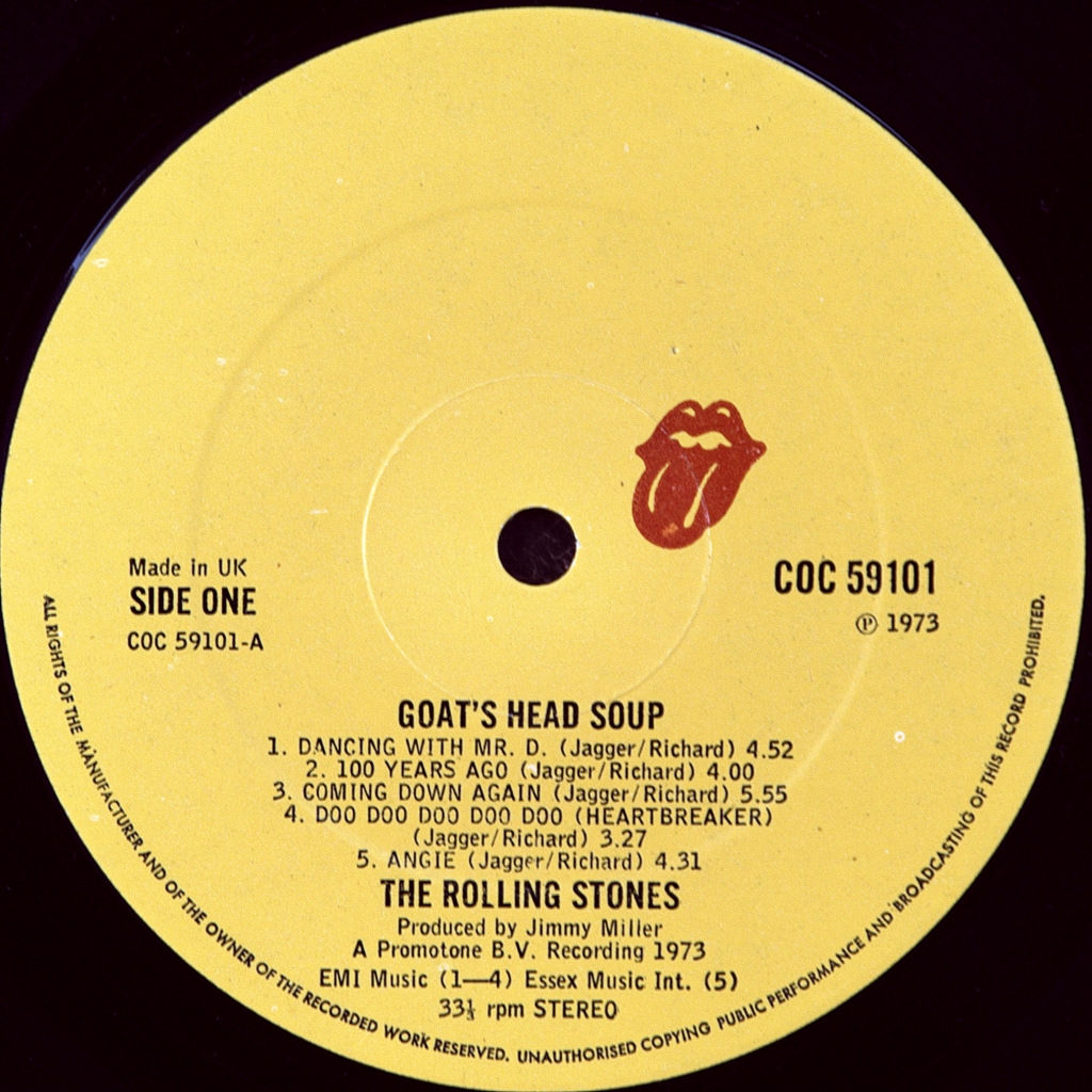 THE ROLLING STONES-GOAT''S HEAD SOUP-1973-FIRST UK PRESS-RS-COC59101. Matrix A-5/B-1. Rare British original cult album. Goats Head Soup is the eleventh Studio album by The Rolling Stones, was published in 1973 on the band's own label. Major hit records was the song "Angie" which reached the top of the hit parade of the USA and was fifth in the UK.