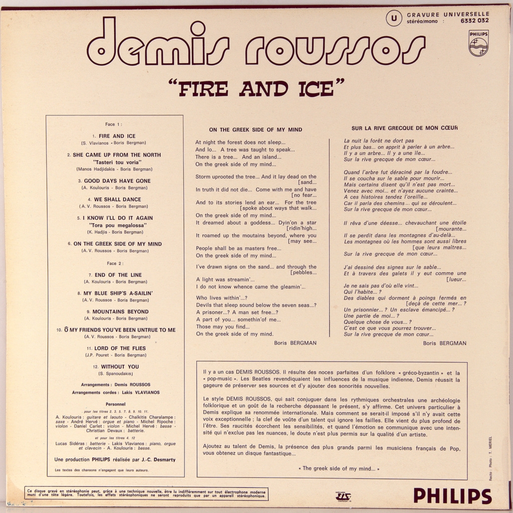 ROUSSOS,DEMIS-FIRE AND ICE-1971-FRANCE FIRST PRESS-PHILIPS-6332032. Matrix A-1/B-1. Demis Roussos - Fire And Ice (1971) First album of Roussos dramatically different from all of his subsequent discs. It's very progressive and very emotional music, more in the spirit of Aphrodite's Child, than the actual fact of Roussos, whom we all know well. And Demis is singing here not tiropita and sterile, like we used to. Very unusual work, though, and fits perfectly into the canvas of art and the folk-rock of the early 70's.