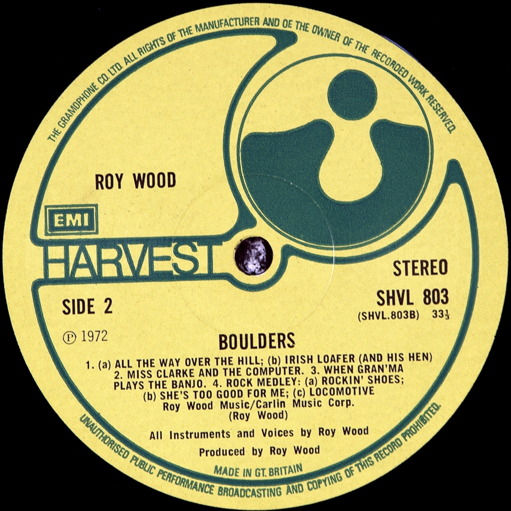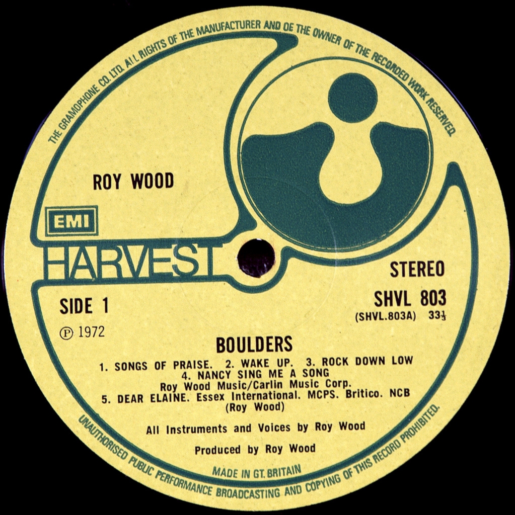 ROY WOOD (EX-MOVE,ELO)-BOULDERS-1972-FIRST UK PRESS-HARVEST-SHVL803. Matrix A-1U/B-1U. Stamper 1M/1G (Dream!) Rare original British cult musician. Boulders is the debut solo album by British musician Roy wood, recorded in 1969-1971 and was released in July 1972 by Harvest Records . Wood began work on the album while still in The Move , and conceived it to use numerous tools. The entry was rather eclectic and eccentric style of many genres such as classical music , art rock , folk , psychedelia , country and rock-n-roll, and illustrates the surreal world of wood. Upon release, the album was critically acclaimed for his individual sound and a great contribution to prog rock , and now considered one of his strongest works. It reached No. 15 in the British album chart and the single "Dear Elaine" was a top 20 hit. The album also reached the Billboard 200 in the United States, where the album was released on United Artists Records .